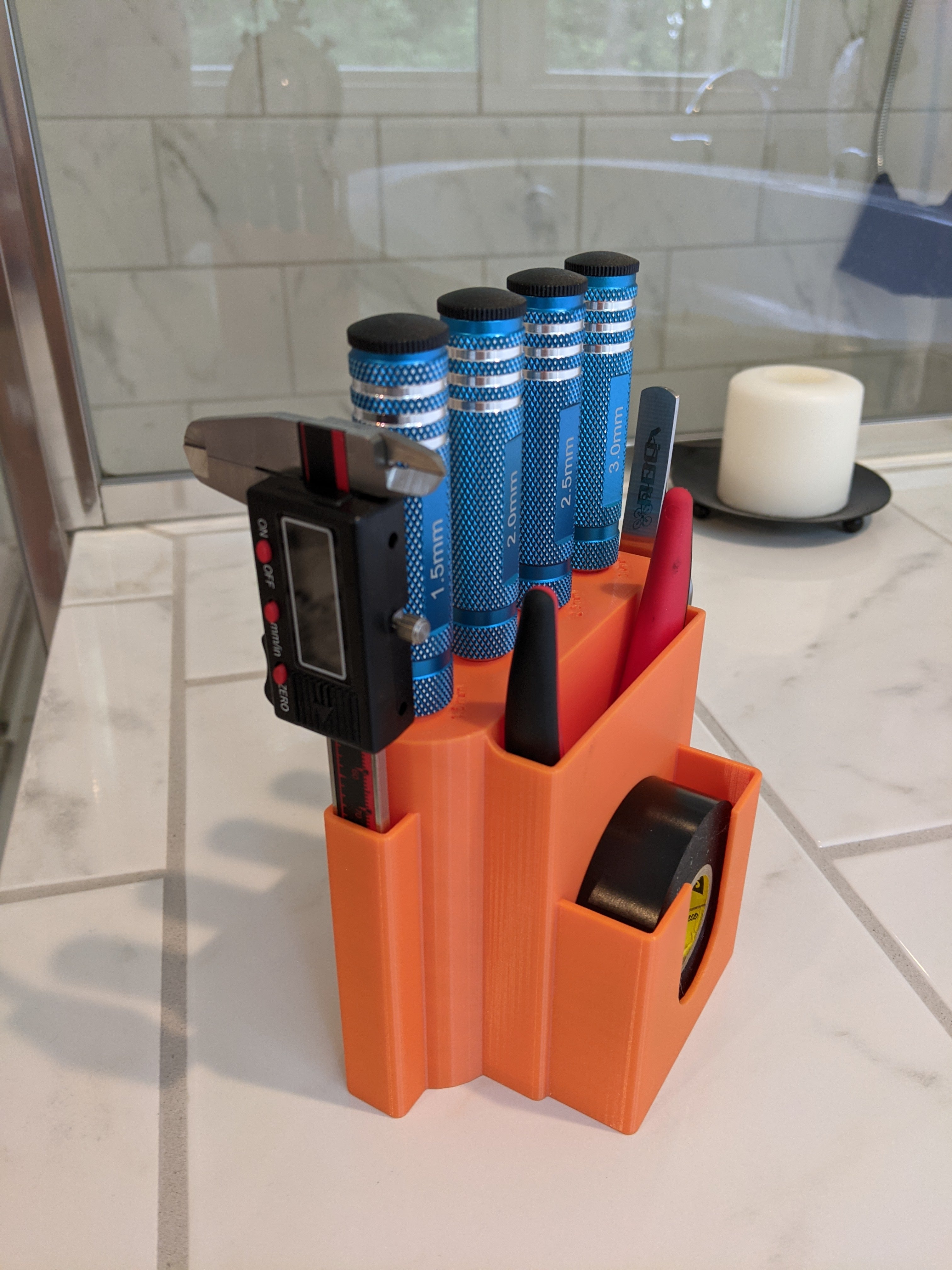En praktisk skrivebordsværktøjsorganisator, der er designet til at holde alle dine daglige værktøjer til at bygge og reparere FPV-droner og 3D-print. Denne organiser reducerer din bygge- og reparationstid betydeligt ved at holde dine mest nødvendige værktøjer lige ved hånden. Den er lavet med orange Hatchbox PLA for at sikre holdbarhed og konsistens.