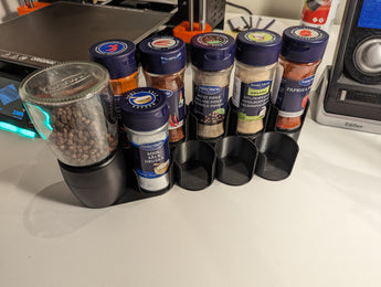 Et enkelt krydderihylde designet til at holde 9 "Santa Maria" krydderiglas og 1 Ikea IHÄRDIG kryddermølle. Hver plads til krydderiglas har en indvendig diameter på 42,2mm. Dette gør organisering og opbevaring af krydderier nemt og praktisk.