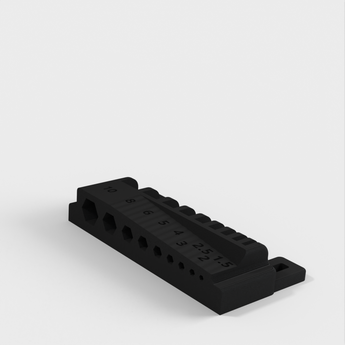 Hex key holder Skadis er et sæt nøgleholder designet til at klare hex nøgler. Det har numre til at angive størrelserne for nem identifikation og lægges nemt på ethvert IKEA Skådis/Skadis panel. Dette design er lidt mere fancy, da nogle af forsiden er skåret af i en vinkel for at spare noget materiale.