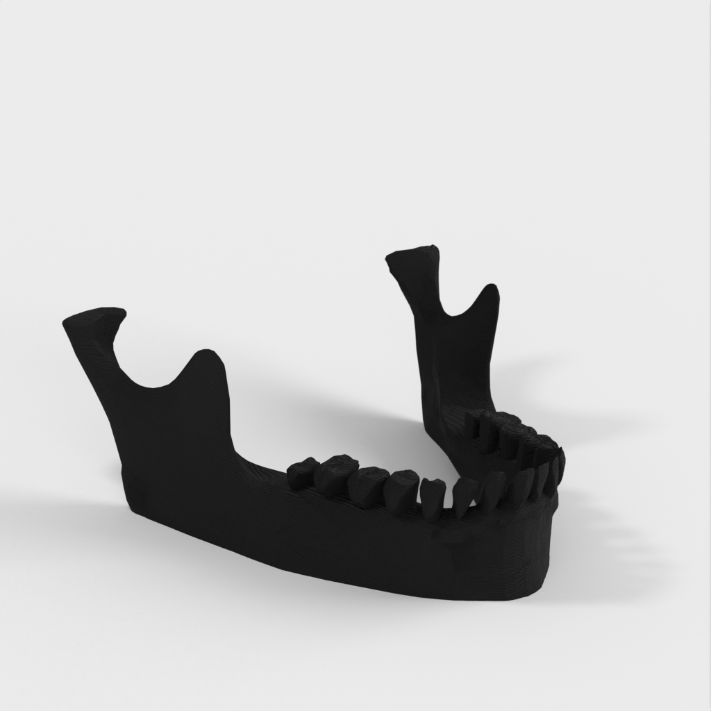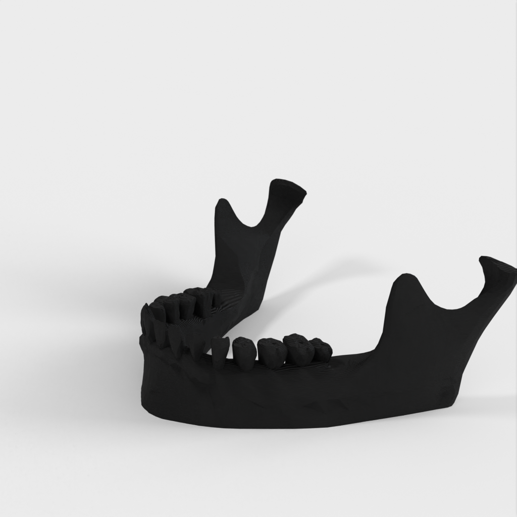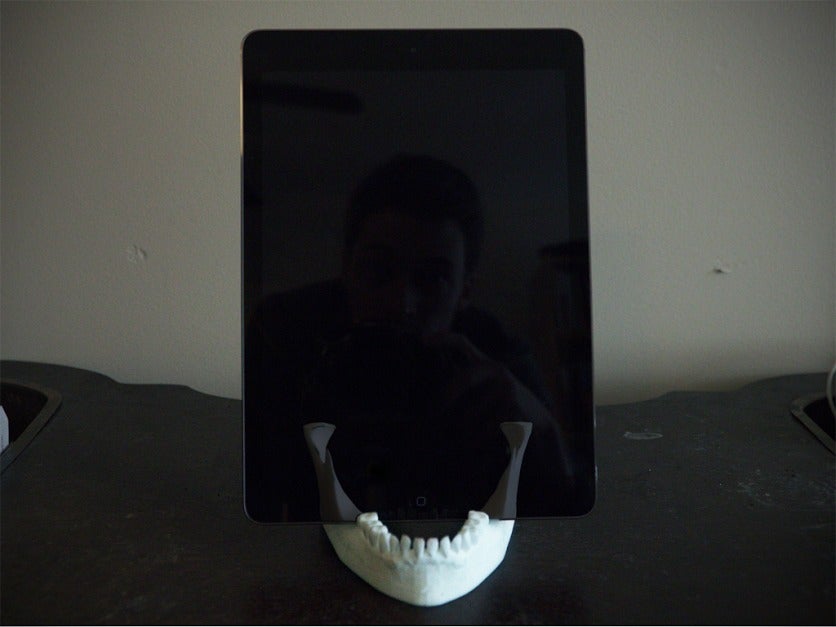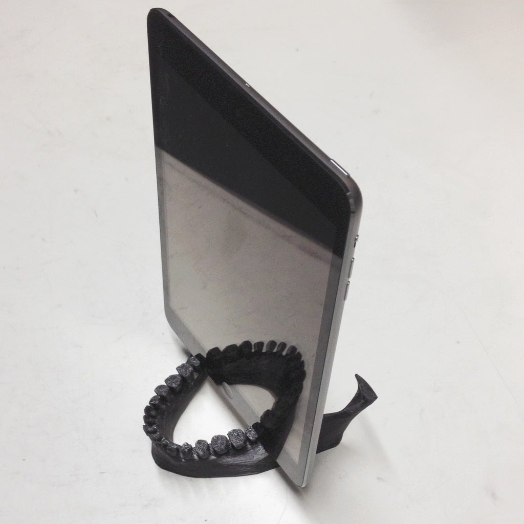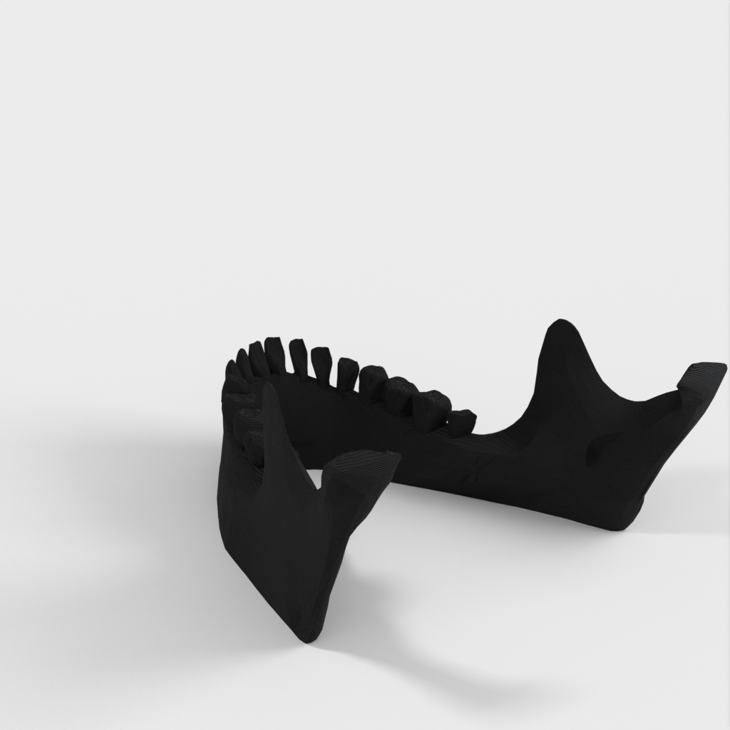 Model af en menneskekæbe der også kan fungere som et stativ til din iPad.