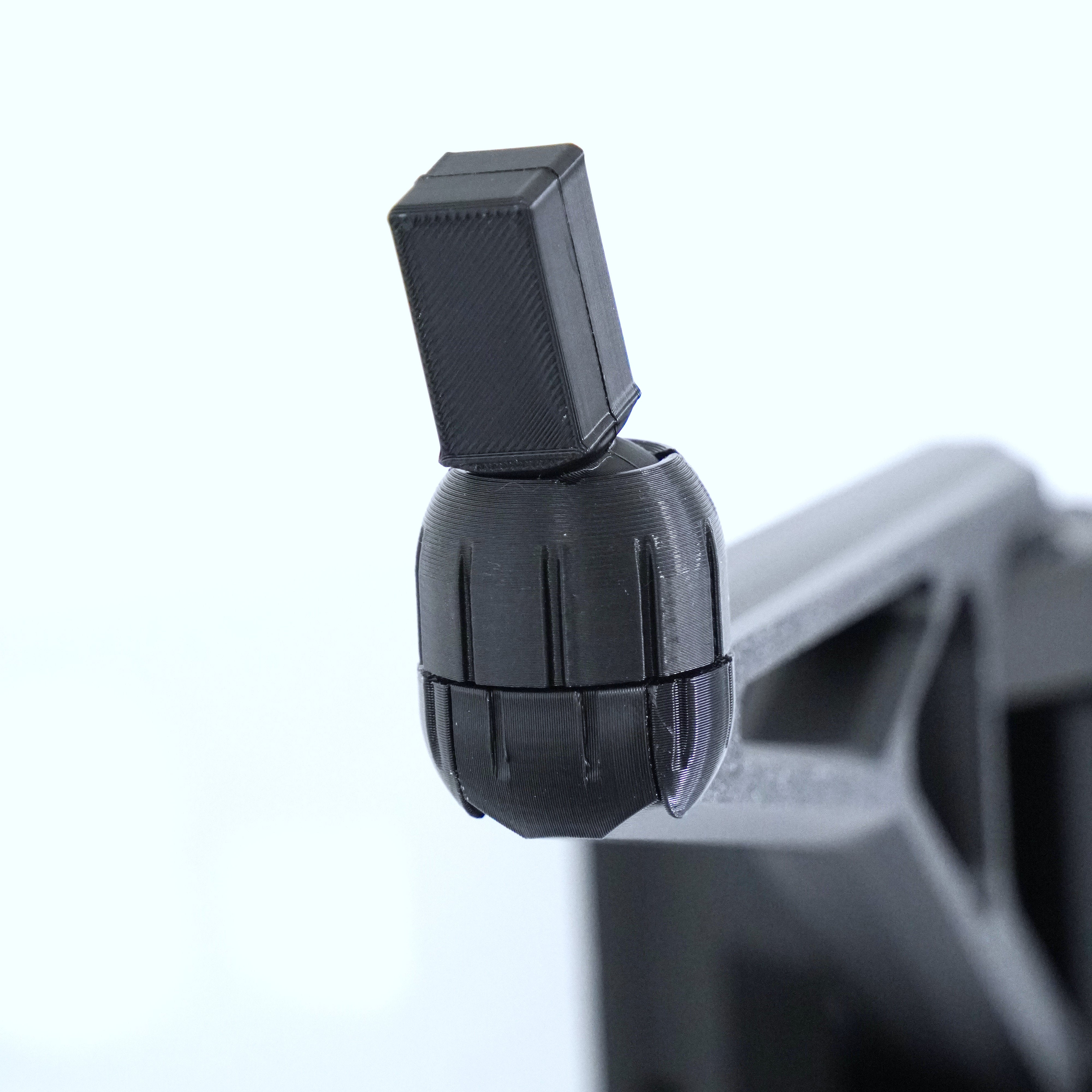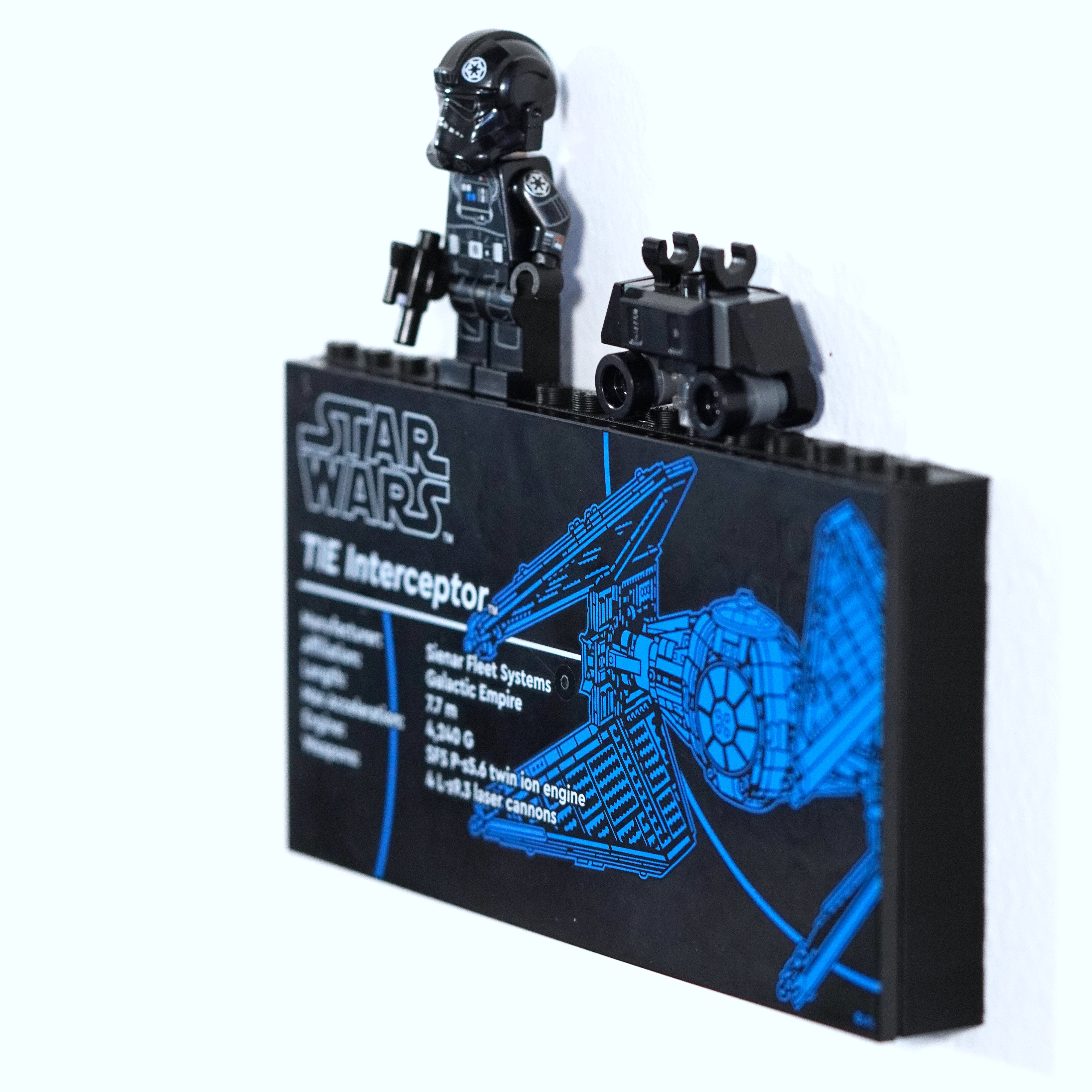 Dette justerbare vægophæng fremviser din UCS Tie Interceptor sikkert og elegant. Den har en drejelig arm og kugleled, der giver mulighed for alsidige vinkler og positioner. Løsningen inkluderer også en separat holder til informationspladen og minifigurer, hvilket sikrer en komplet præsentation af din samling.