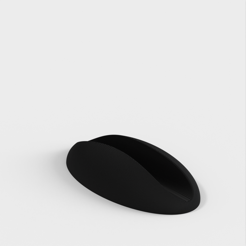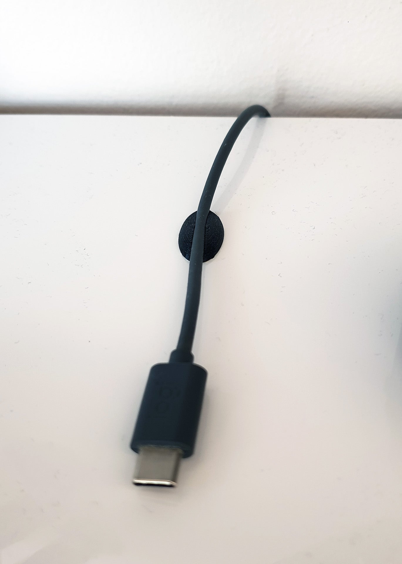 Enkel kabelholder til skrivebord. Brug tynd dobbeltklæbrig tape til at fastgøre holderen til skrivebordet.