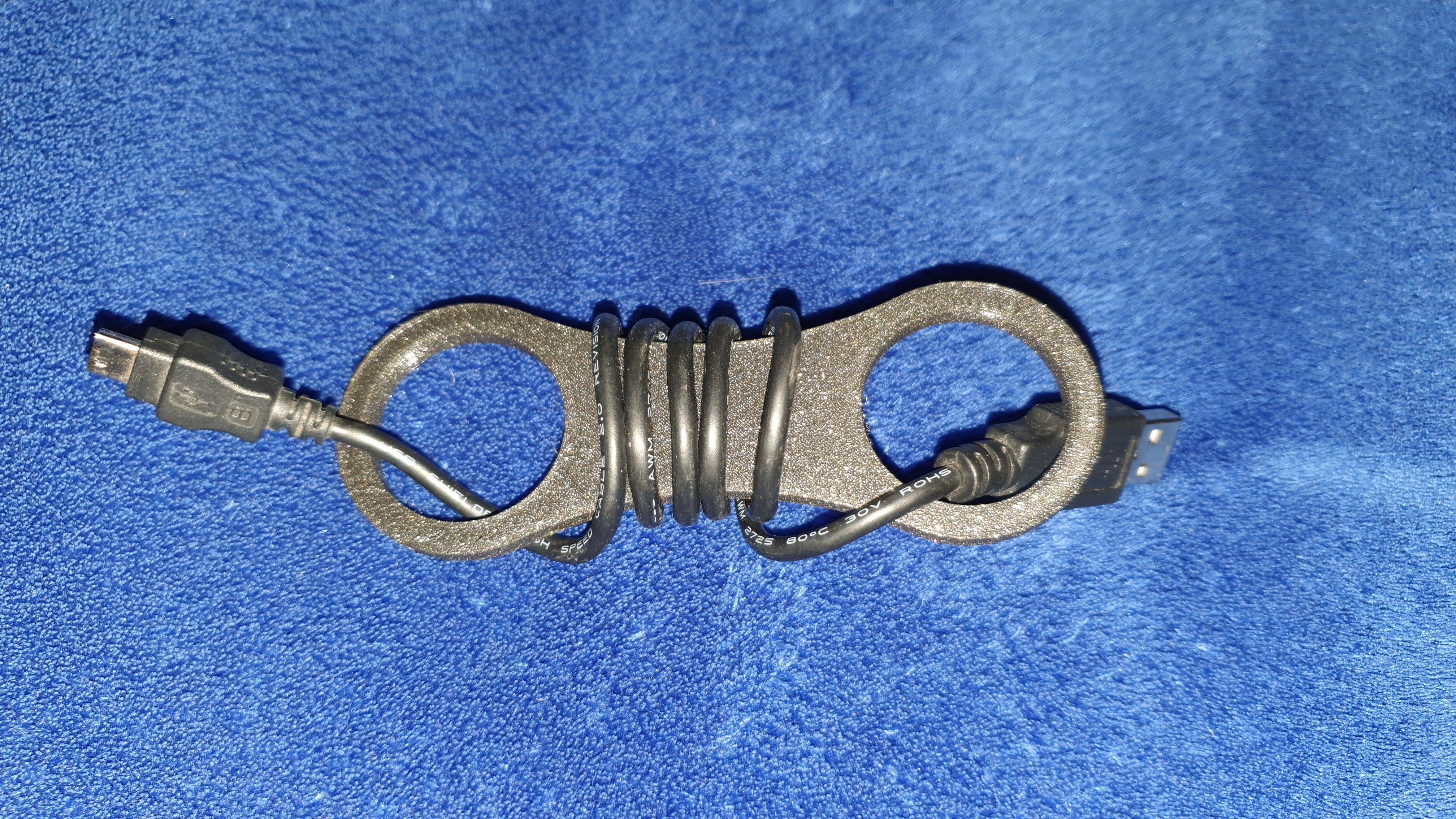 Dette er en kabelholder, der gør det nemt for dig at organisere dit rod af kabler. Du skal blot placere den ene ende af kablet i det ene hul, vikle kablet omkring midten og placere den anden ende af kablet i det andet hul. Det er en enkel og effektiv løsning til at skabe orden i dine kabler.