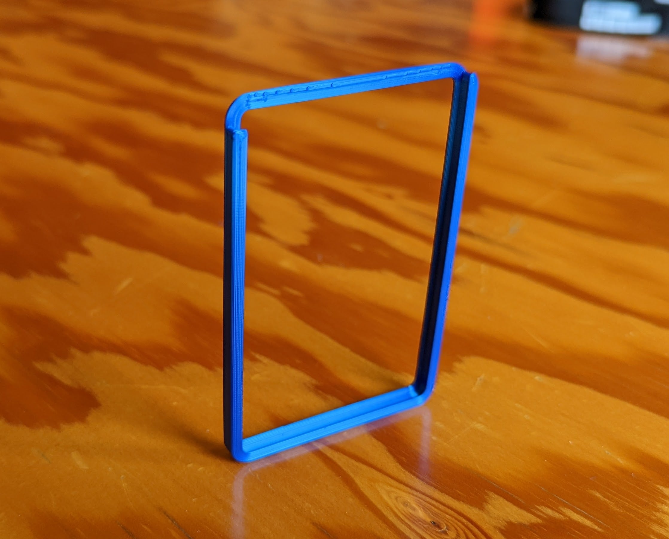 Minimalistisk åben tegnebog, der udskrives på mindre end 20 minutter og kan rumme mellem 3 og 5 kort afhængigt af modellen. De yderste kort vises fuldt ud, og alle kort holdes på plads ved hjælp af en lille kant foroven. En mindre variation i kortenes tykkelse vil passe på grund af den skrå top, som også giver fjedrende tryk for at holde kortene på plads. De yderste kort kan fjernes med én hånd ved at bøje kortene lidt og skubbe op på forsiden.