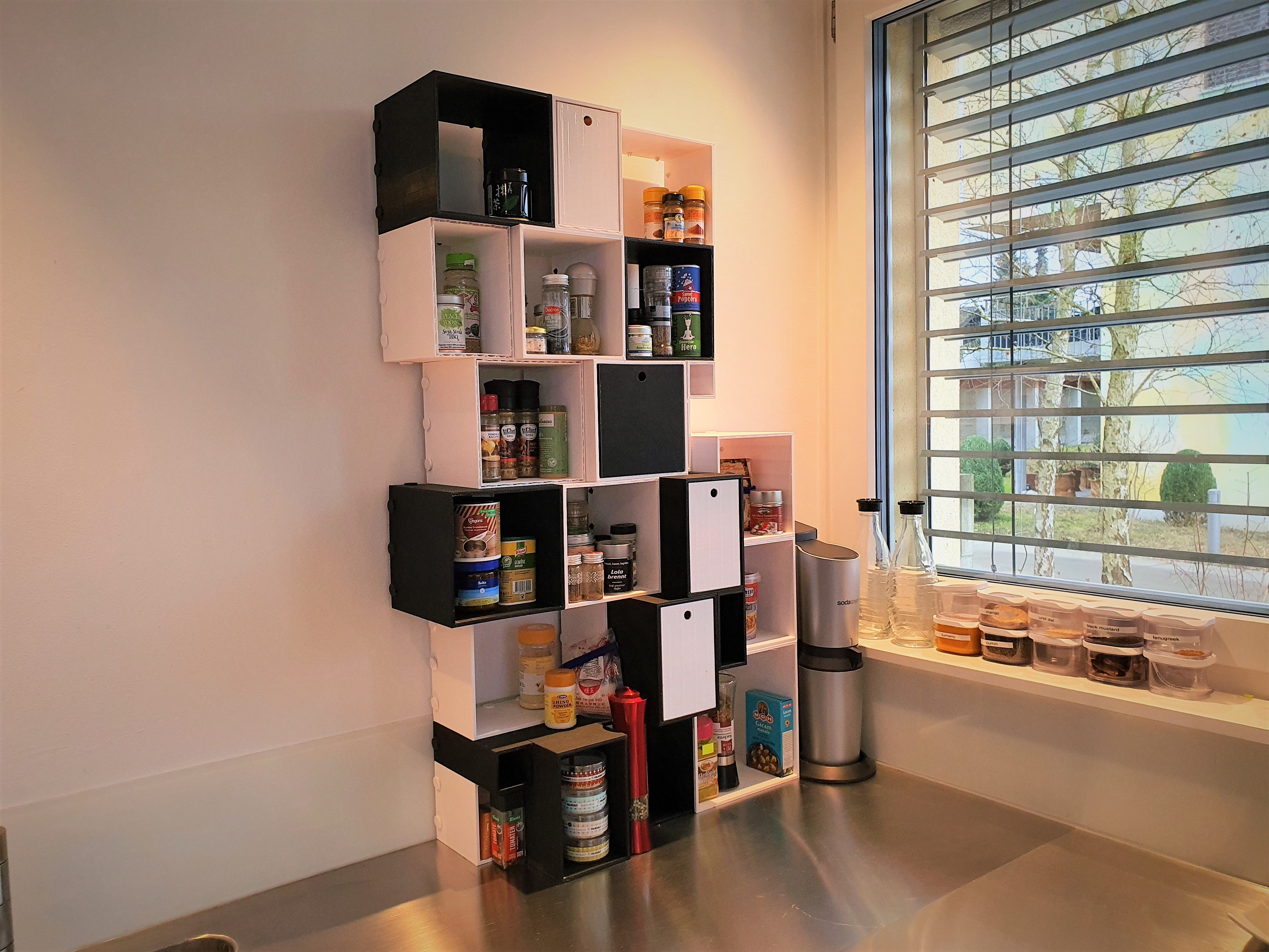Modular krydderihylde, som er en let måde at organisere dine krydderier på. Passer godt til ethvert køkken og giver en nem tilgang til alle dine favoritkrydderier. Hvert modul kan placeres individuelt eller klippes sammen med andre moduler ved hjælp af de inkluderede pins. Brug de korte pins til at dække hullerne, som ikke er fastgjort til andre bokse.