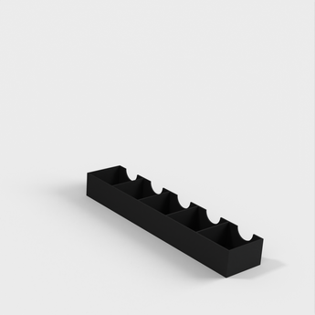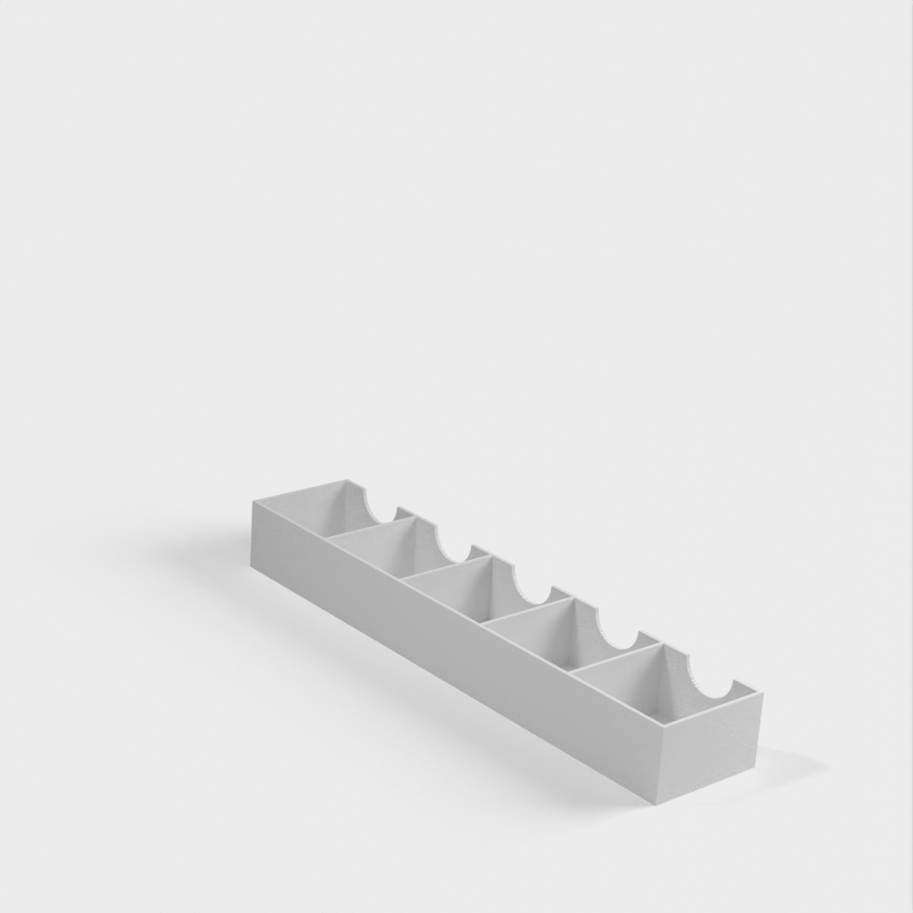 Denne holder kan nemt monteres på skabsdøre ved hjælp af dobbeltklæbende tape for nem og praktisk opbevaring. Den kan tilpasses til dine specifikke behov ved hjælp af OpenSCAD og kan holde kvadratiske 45 mm flasker.