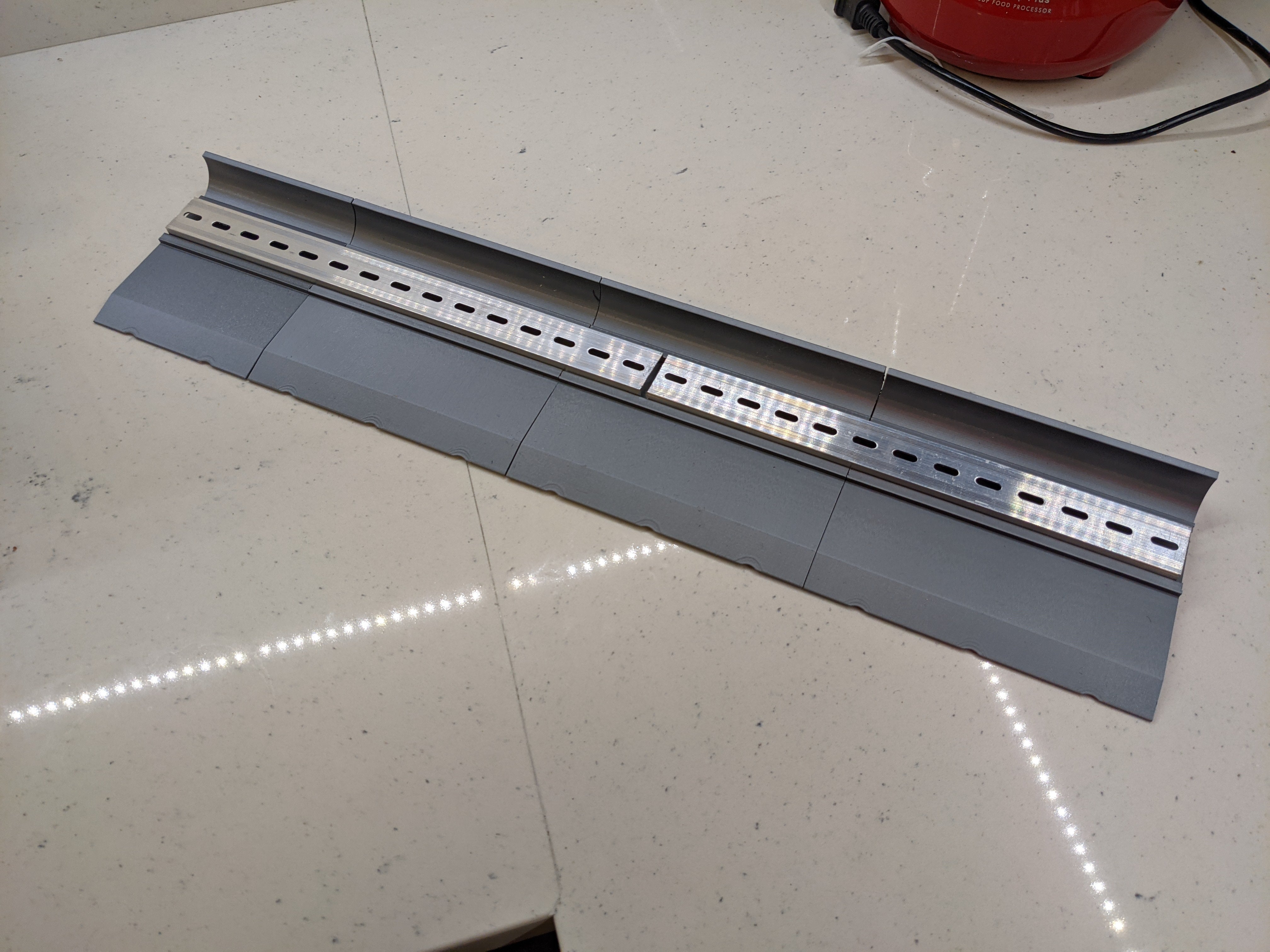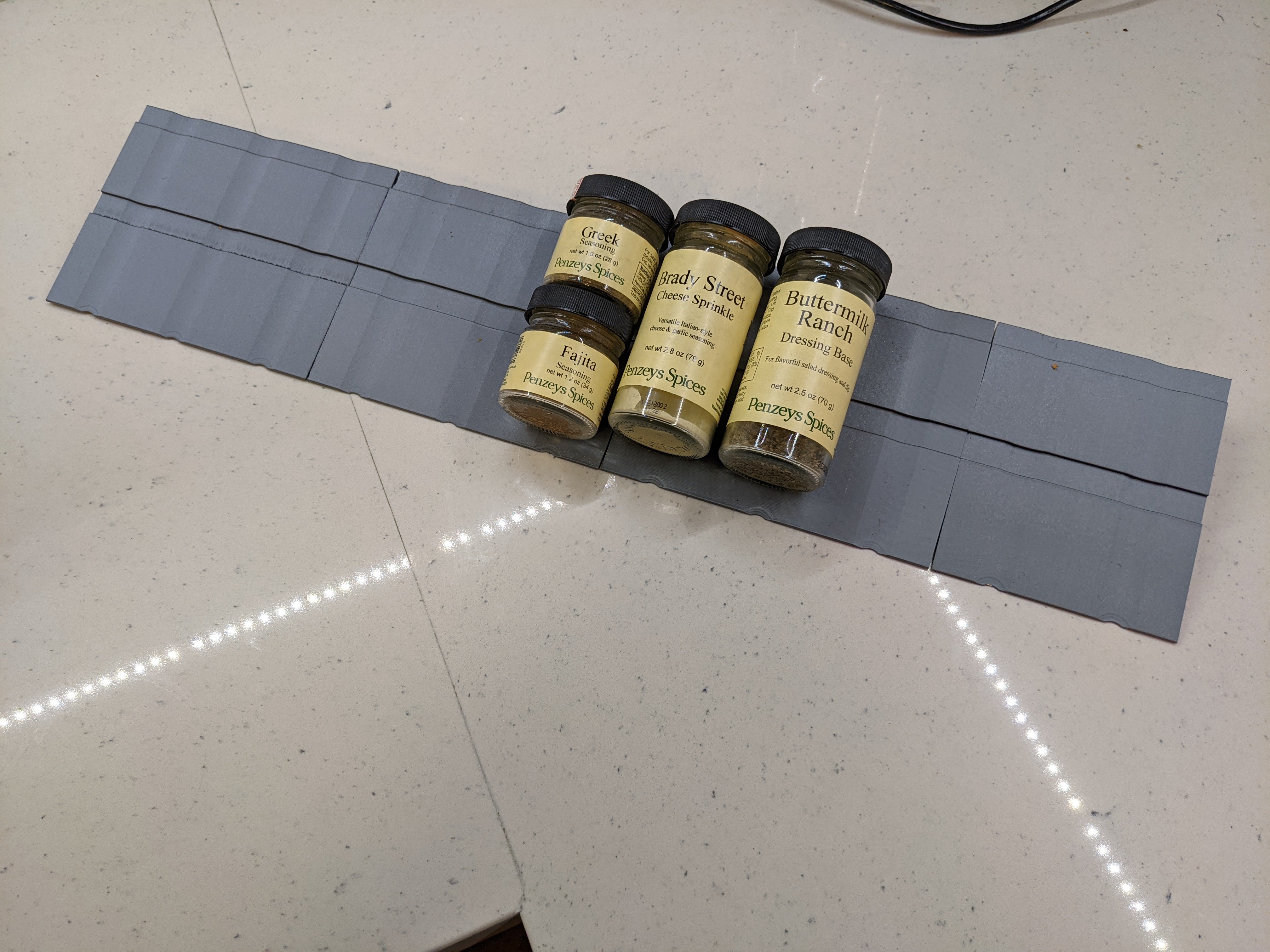 Dette er en skuffeformet krydderihylde fra Penzys, der er designet til at rumme enten to 1/4 kopp eller en 1/2 kopp Penzys Spice Jars. Den underdel af delene har en DIN-skinne, der gør det muligt at sammenføje flere udskrifter med en solid ramme.