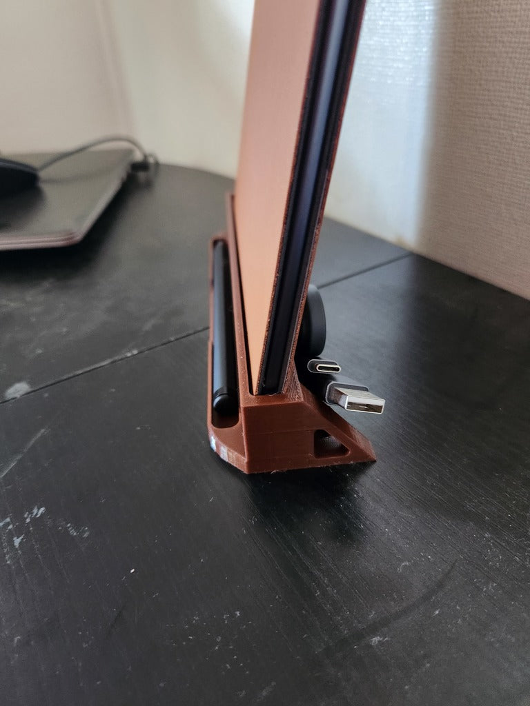 Denne stand er udviklet til at placere din reMarkable 2 i en stabil og passende vinkel, hvilket understøtter en komfortabel arbejdsgang ved notetagning, tegning eller læsning. Standeren inkluderer smarte løsninger til opbevaring af vigtigt tilbehør: der er plads til dit cover, en dedikeret holder til dit ladekabel, samt en udskiftelig spids. Dette design bidrager til at holde din arbejdsstation organiseret og sikrer, at dit reMarkable 2 og dets tilbehør er samlet og let tilgængeligt. Den funktionelle form gør den til et praktisk supplement for enhver bruger, der ønsker en mere strømlinet anvendelse af sin tablet.