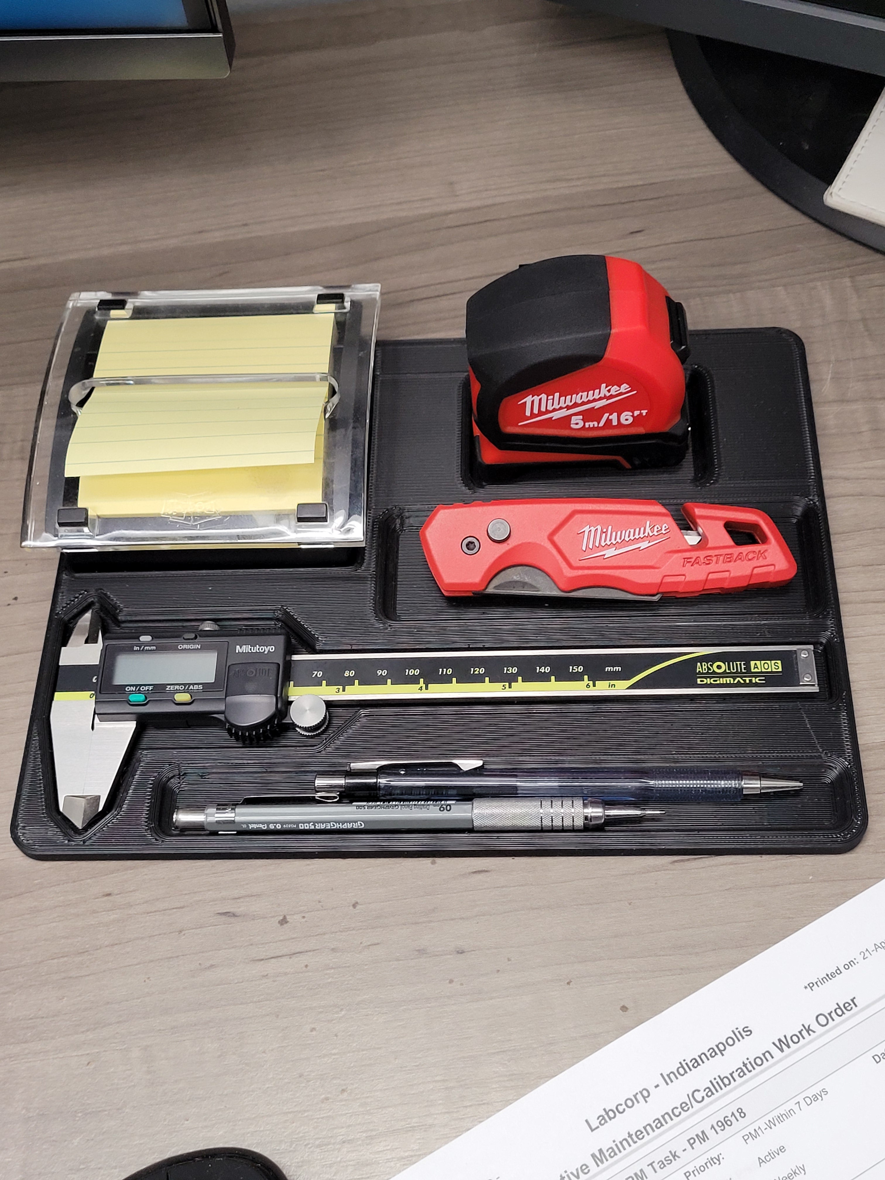 Skrivebordsorganisator med Mitutoyo Kaliber og Milwaukee Målebånd og Kniv