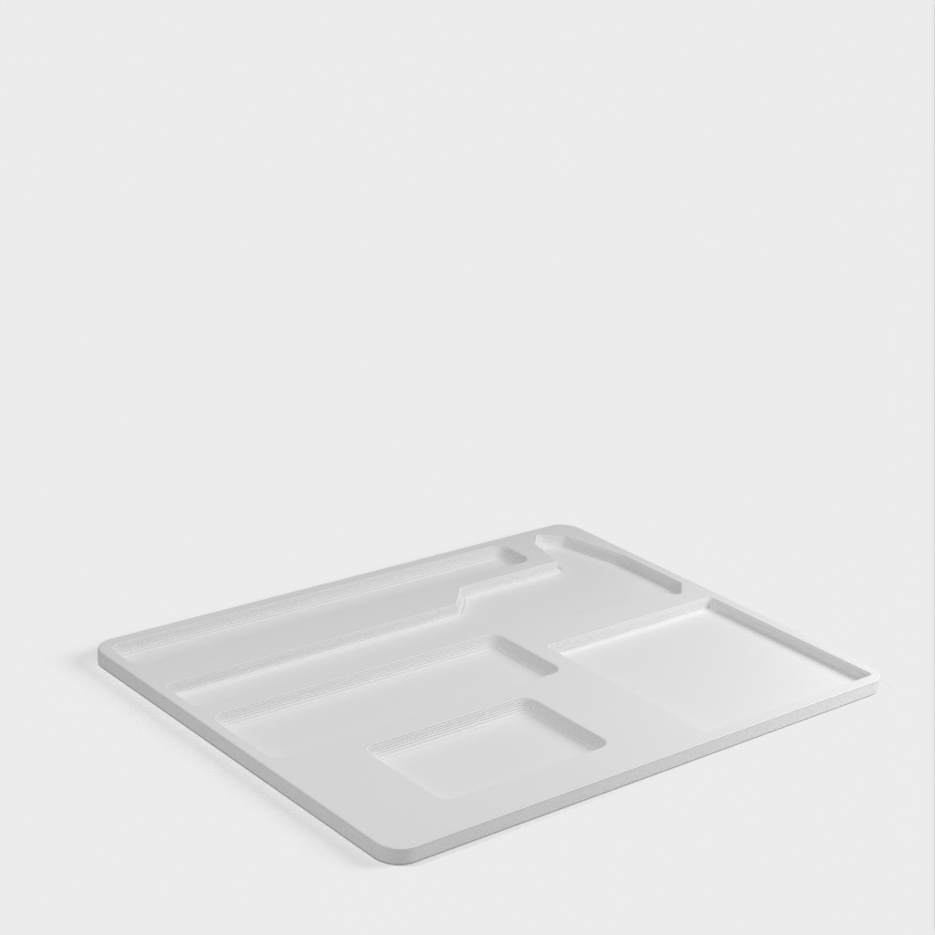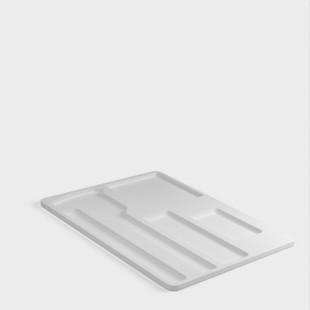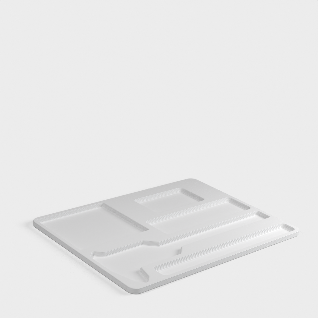Dette er en skrivebordssorterer, som indbefatter forskellige værktøjer og elementer, der er nødvendige for et organiseret og funktionelt arbejdsområde. Den inkluderer en CD-6" ASX Mitutoyo skruemåler, et Milwaukee 48-22-6617 målebånd, en Milwaukee 48-22-1501 hobbykniv, og en Post-it Pop Up Holder til noter. Der er også udset et sted til kuglepenne, blyanter og lignende nødvendigheder.