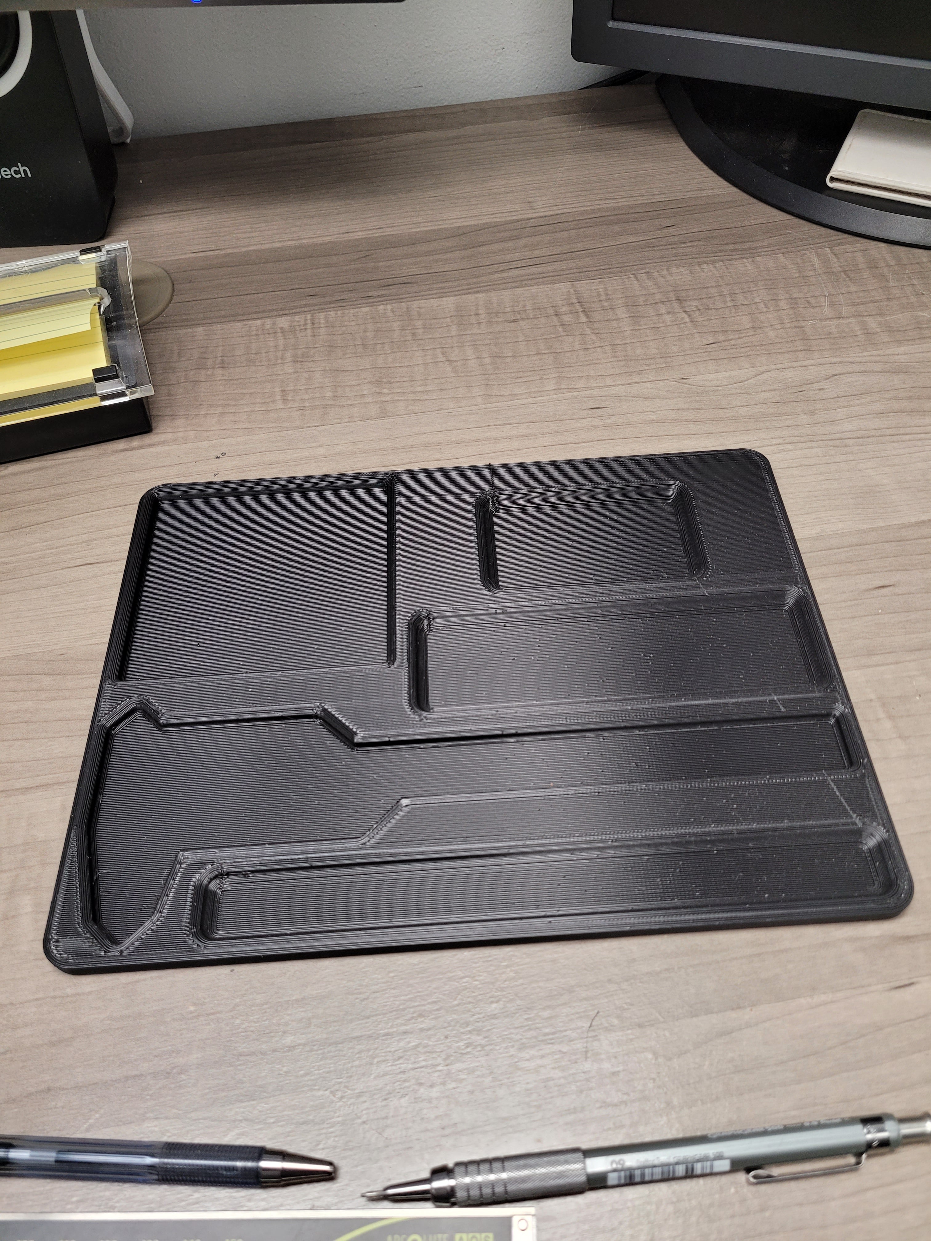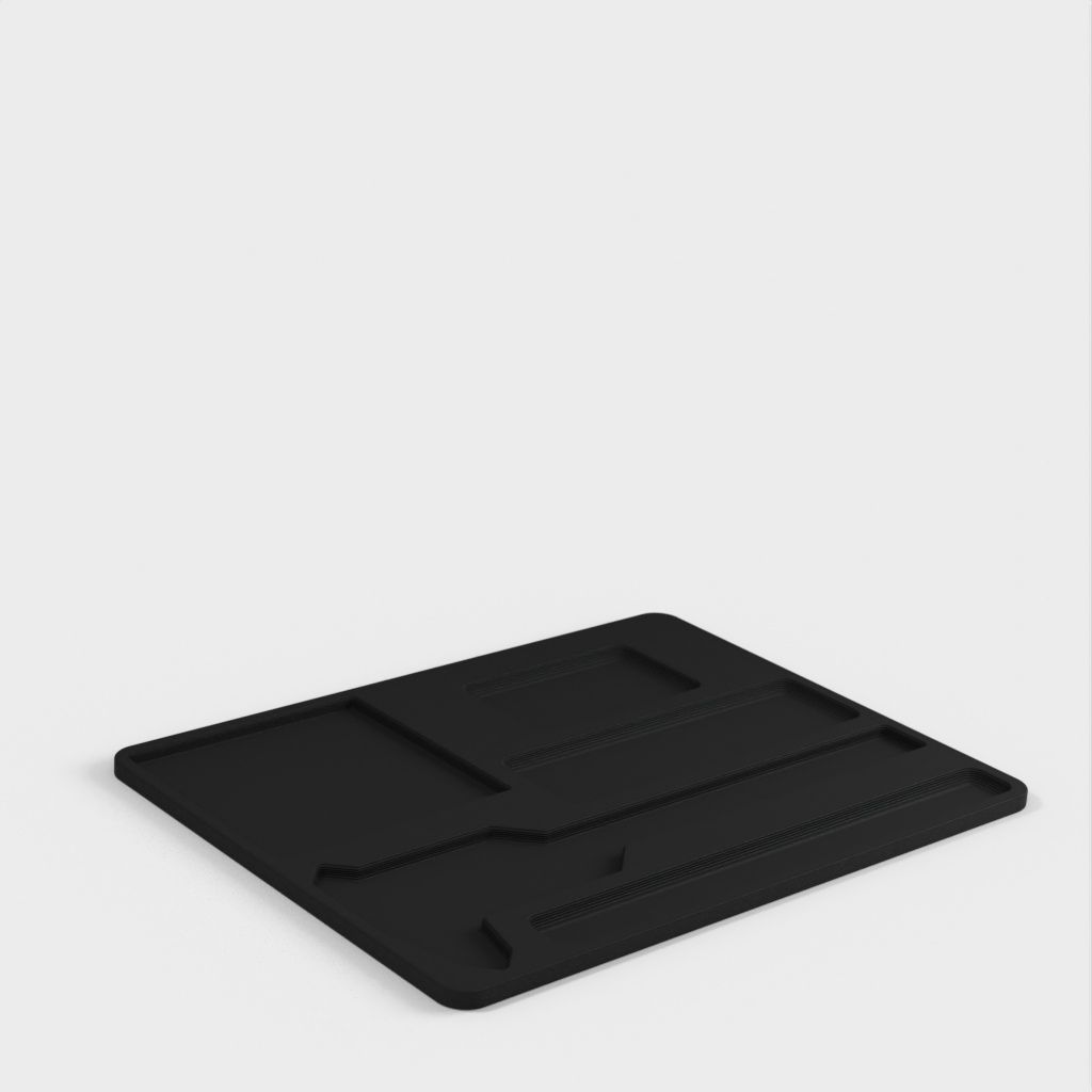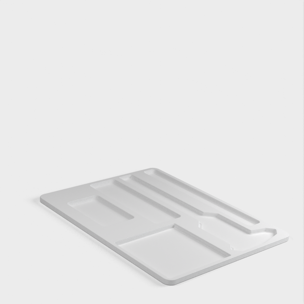 Dette er en skrivebordssorterer, som indbefatter forskellige værktøjer og elementer, der er nødvendige for et organiseret og funktionelt arbejdsområde. Den inkluderer en CD-6" ASX Mitutoyo skruemåler, et Milwaukee 48-22-6617 målebånd, en Milwaukee 48-22-1501 hobbykniv, og en Post-it Pop Up Holder til noter. Der er også udset et sted til kuglepenne, blyanter og lignende nødvendigheder.