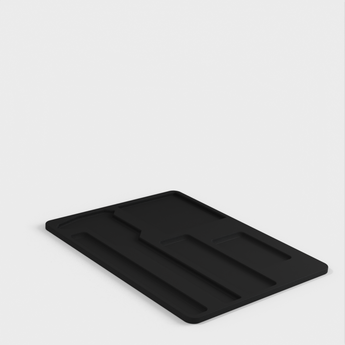 Dette er en skrivebordssorterer, som indbefatter forskellige værktøjer og elementer, der er nødvendige for et organiseret og funktionelt arbejdsområde. Den inkluderer en CD-6" ASX Mitutoyo skruemåler, et Milwaukee 48-22-6617 målebånd, en Milwaukee 48-22-1501 hobbykniv, og en Post-it Pop Up Holder til noter. Der er også udset et sted til kuglepenne, blyanter og lignende nødvendigheder.