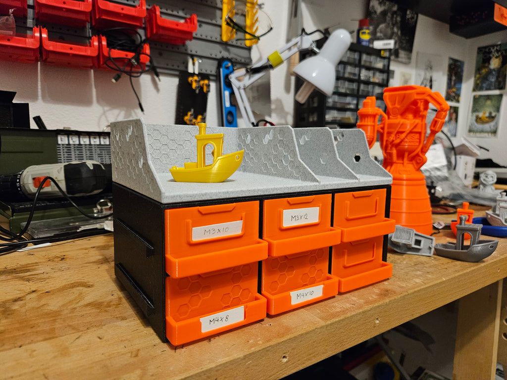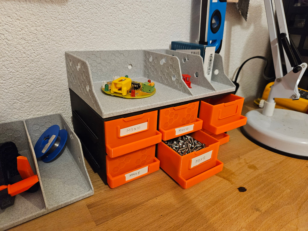 Dette modulære skuffeskab er designet til at bringe orden og effektivitet til dit værksted, hobbyrum eller enhver anden plads, hvor små dele og værktøj skal holdes organiseret. Systemet består af stabelbare hylder og skuffer med fleksible rumdelere, hvilket giver dig mulighed for at tilpasse opbevaringen præcist til dine behov. Uanset om du skal opbevare skruer, elektronikkomponenter, håndværksmaterialer eller endda en el-skruemaskine og dens bits, tilbyder dette skab en praktisk løsning. Skufferne er udstyret med et smart anti-skrid system, der forhindrer dem i at falde ud, når du flytter på hylderne. For yderligere nemhed kan du anvende de integrerede mærkningsfelter til enten papirlabels eller 3D-printede etiketter, så du hurtigt kan identificere indholdet. Med forskellige hyldekonfigurationer, herunder 3x4, 3x3 og 3x2 skuffer, kan du skabe en skræddersyet opbevaringsløsning, der maksimerer din pladsudnyttelse. Dette er en ideel organiseringsløsning for dem, der søger et struktureret miljø, hvor alt har sin plads.