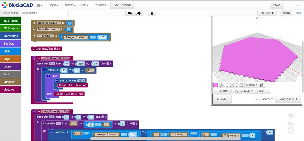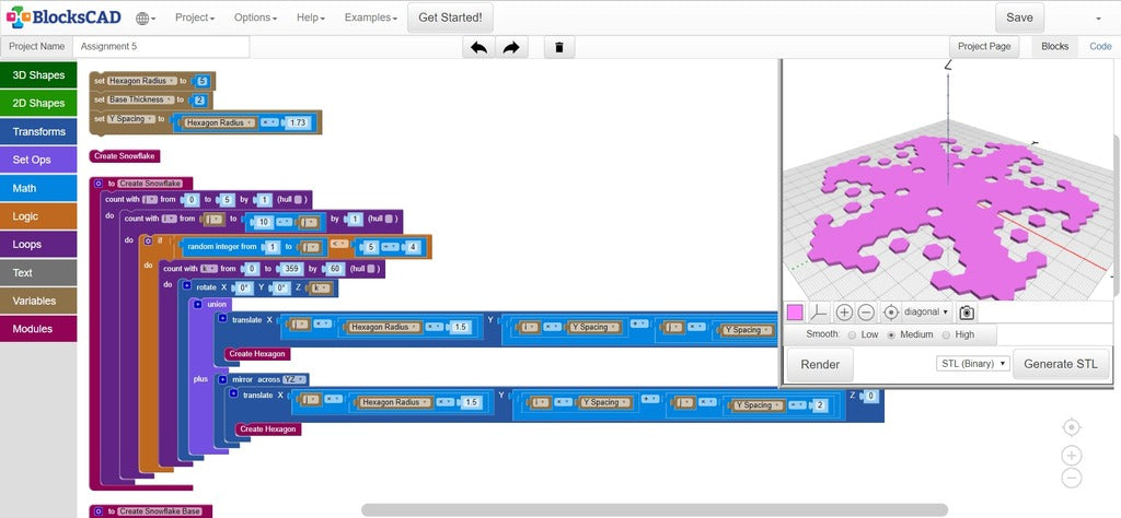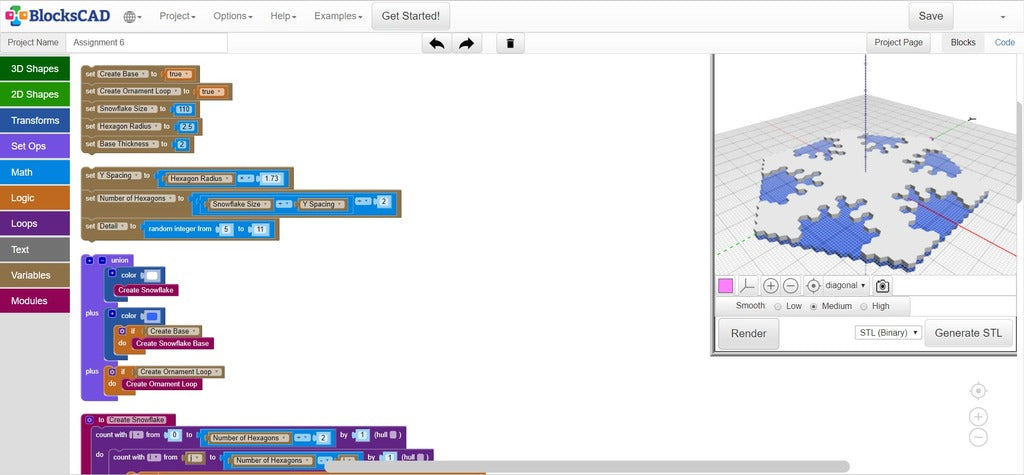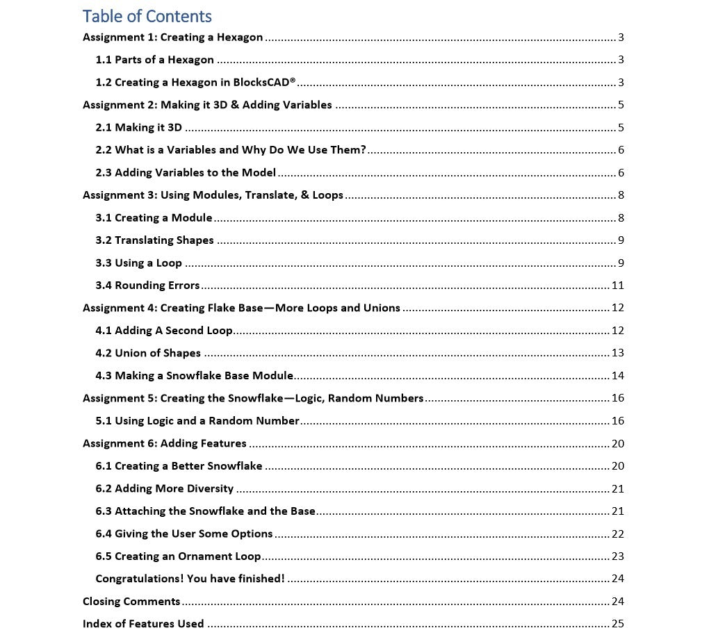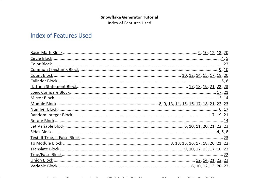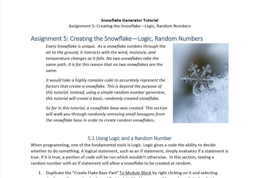 Denne Snowflake Generator Tutorial er skabt som en del af BlocksCAD® Snowflake Challenge. Tutorialen er designet til at øge interessen for STEM områderne (videnskab, teknologi, ingeniørarbejde og matematik) blandt studerende. Den består af et trin-for-trin vejledning til at oprette en random snefnugs-generator. Med syv XLF-filer, herunder den fuldførte "Snowflake Generator.xlm" fil, samt flere billeder og fire STL-filer ki, eleverne se, hvordan deres arbejde vil se ud som 3D-printede snefnug.