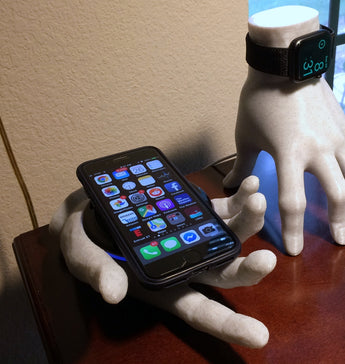 Der er plads til en trådløs oplader inde i selve hånden. Indhakket er lavet så den passer til en trådsløs opalder der er formet som en cirkel med en maksimal diameter på 94mm.