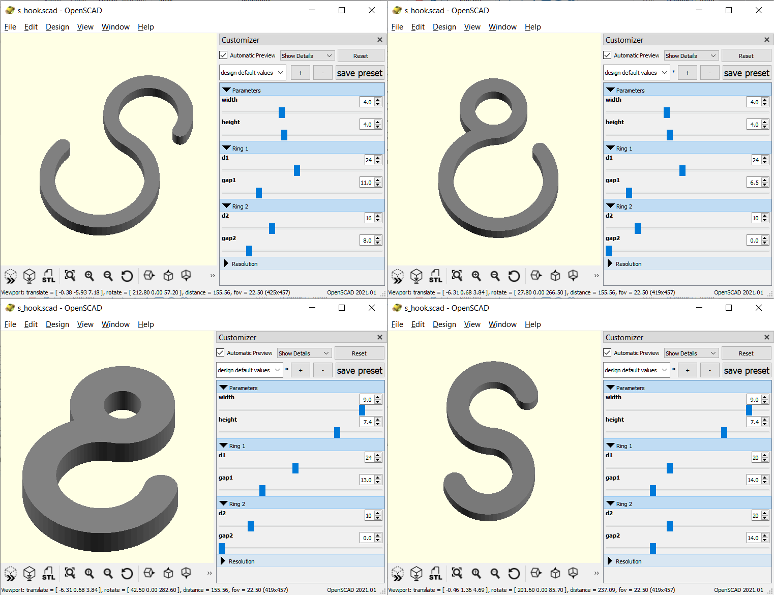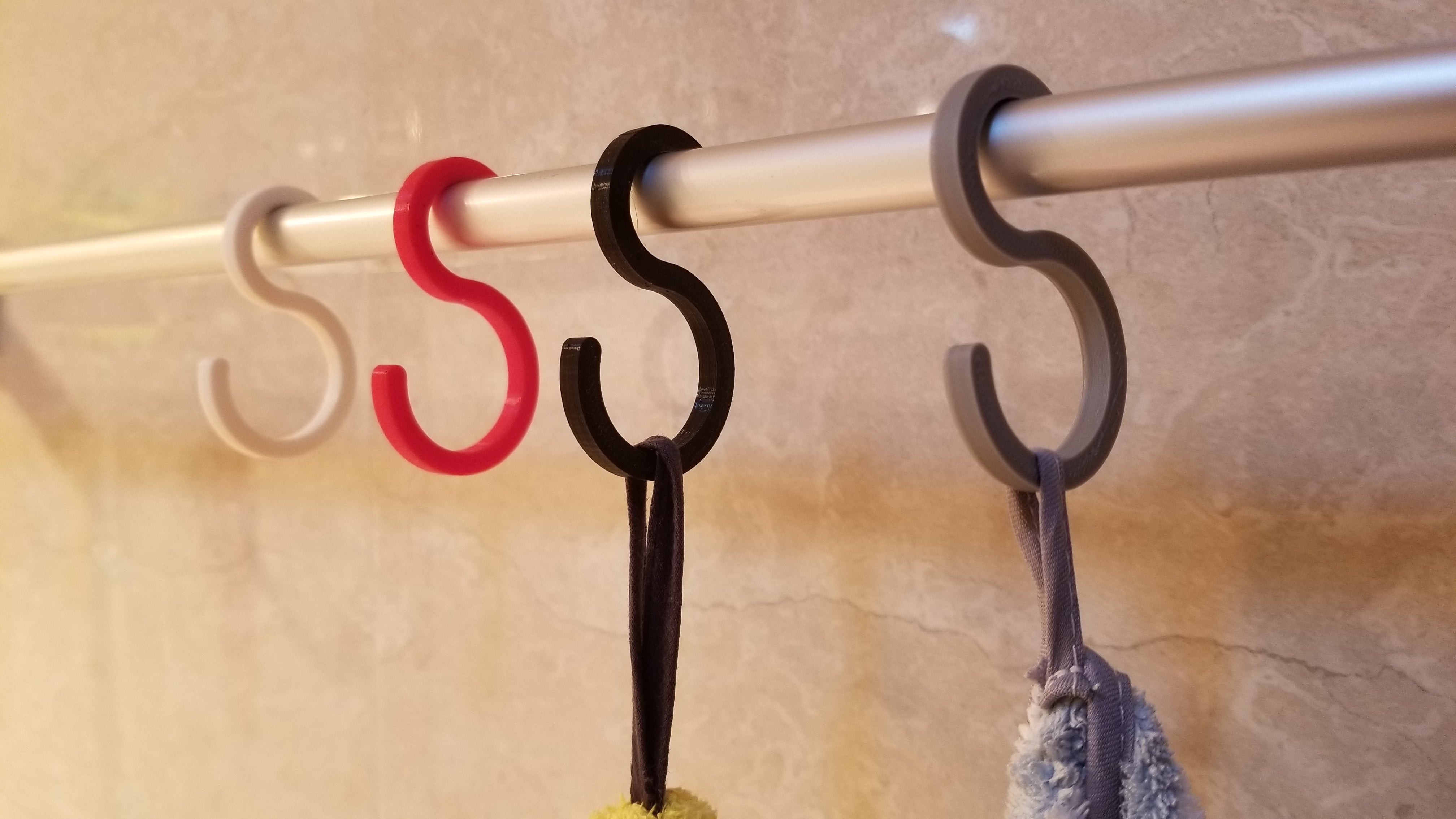 Disse brugerdefinerede S-kroge kan tilpasses efter dine præferencer. De er ideelle til brug i både badeværelset og køkkenet og kan printes meget hurtigt uden brug af meget materiale.