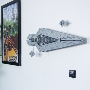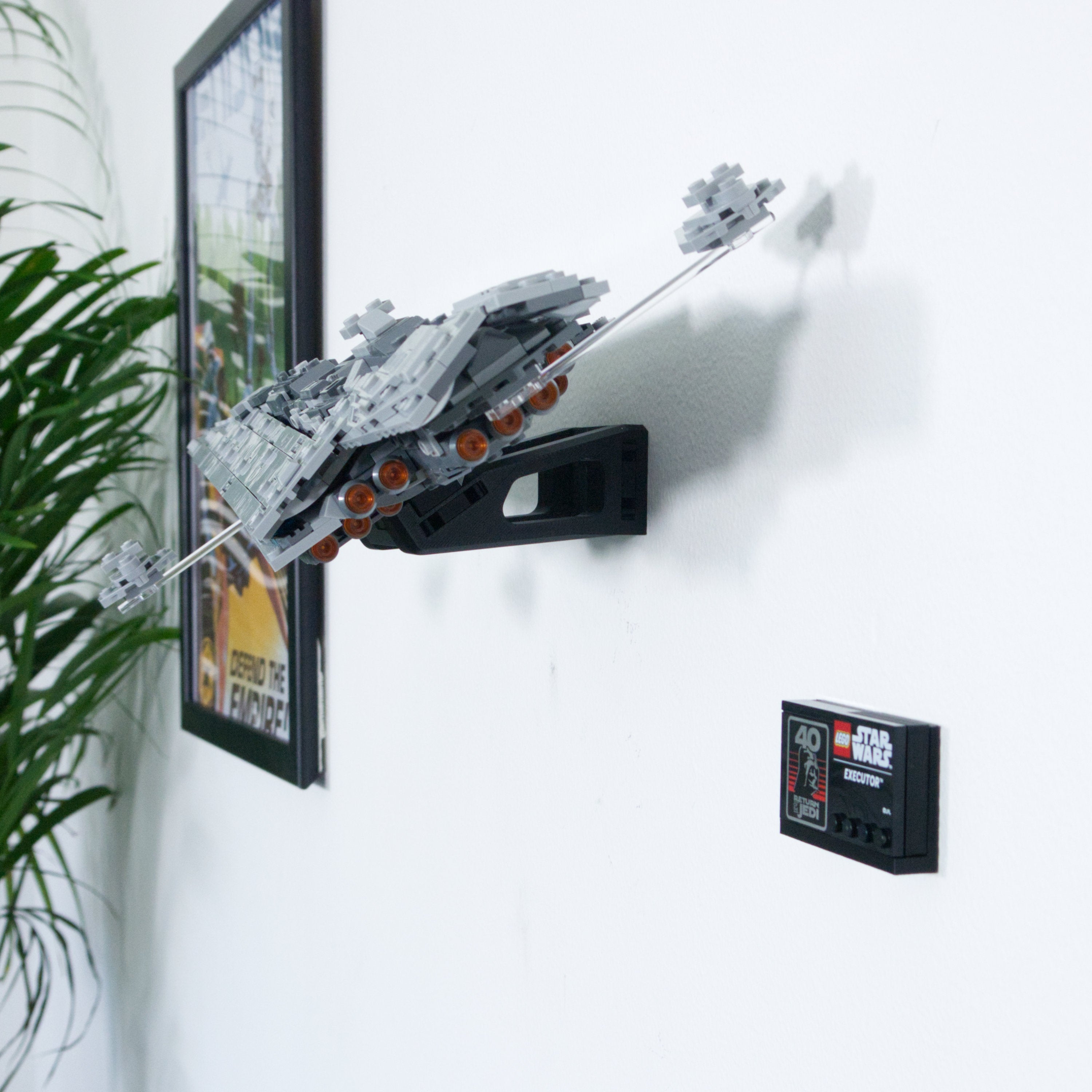 Fremvis din LEGO Star Wars Executor Super Star Destroyer horisontalt med dette vægbeslag, der giver mulighed for at vende modellen mod enten venstre eller højre. Konstruktionen sikrer, at sættet nemt kan tages ned ved behov. Der medfølger desuden holdere til både navneskilt og jubilæumskort for en komplet præsentation på væggen.