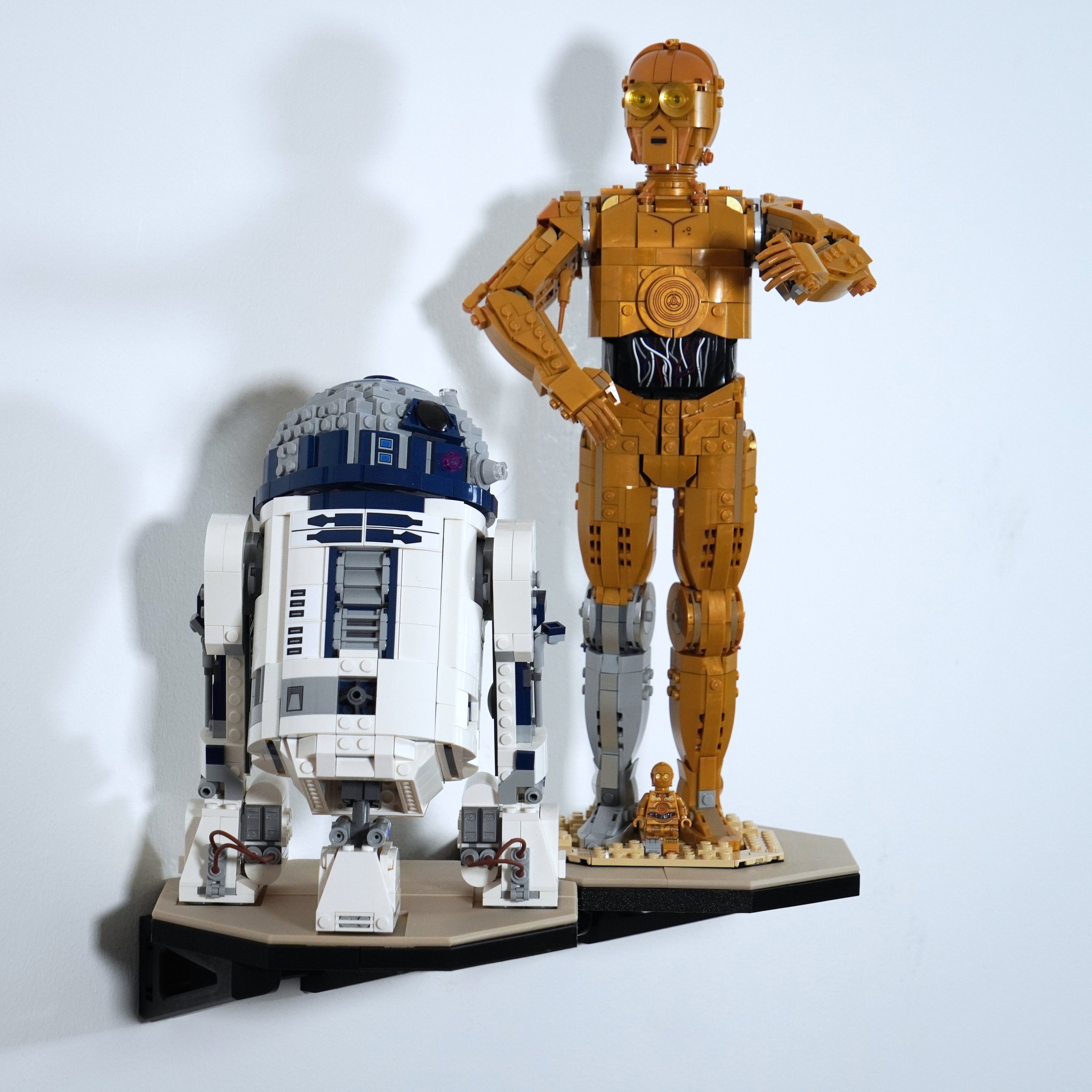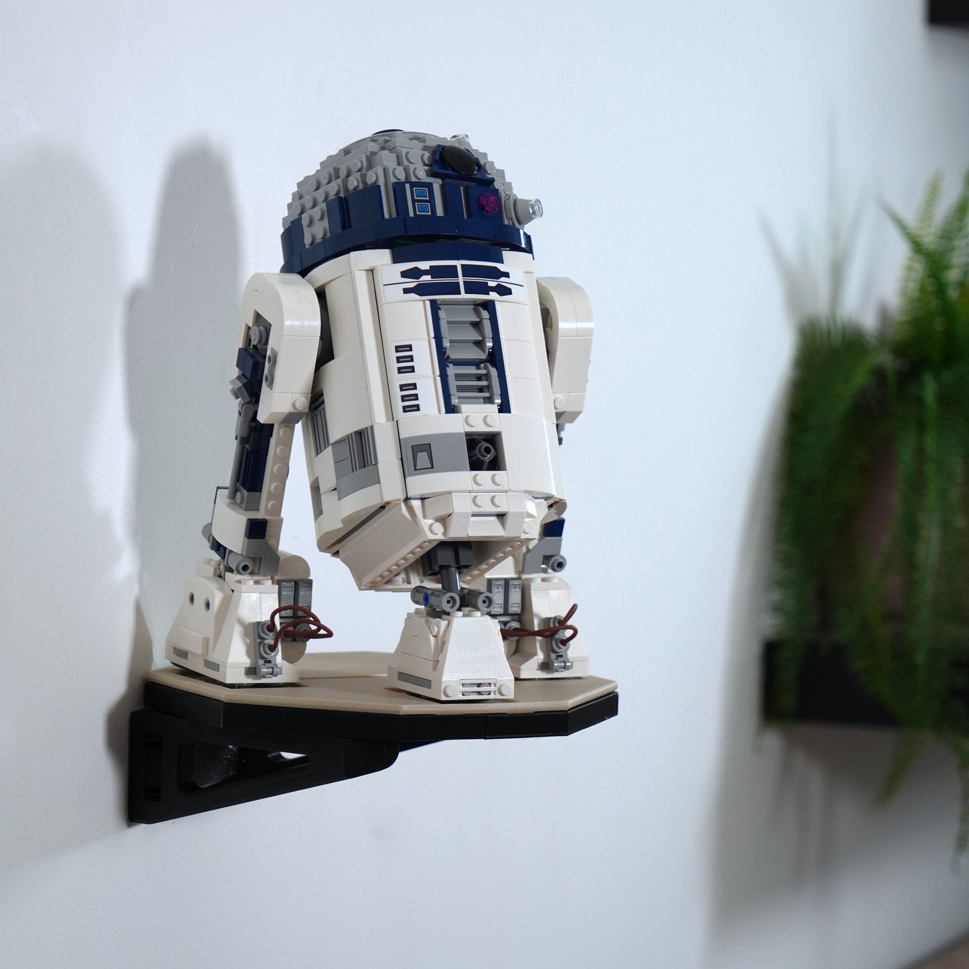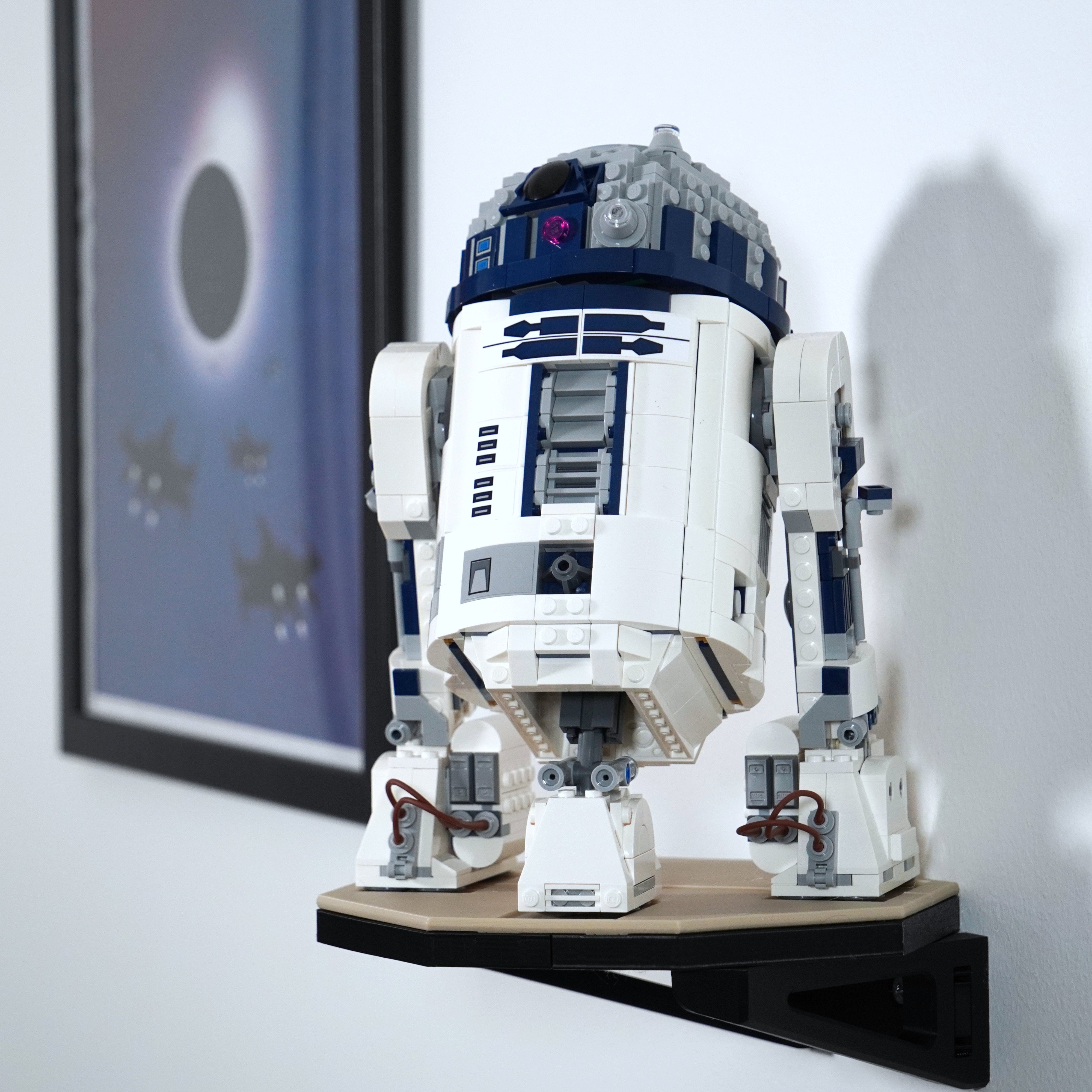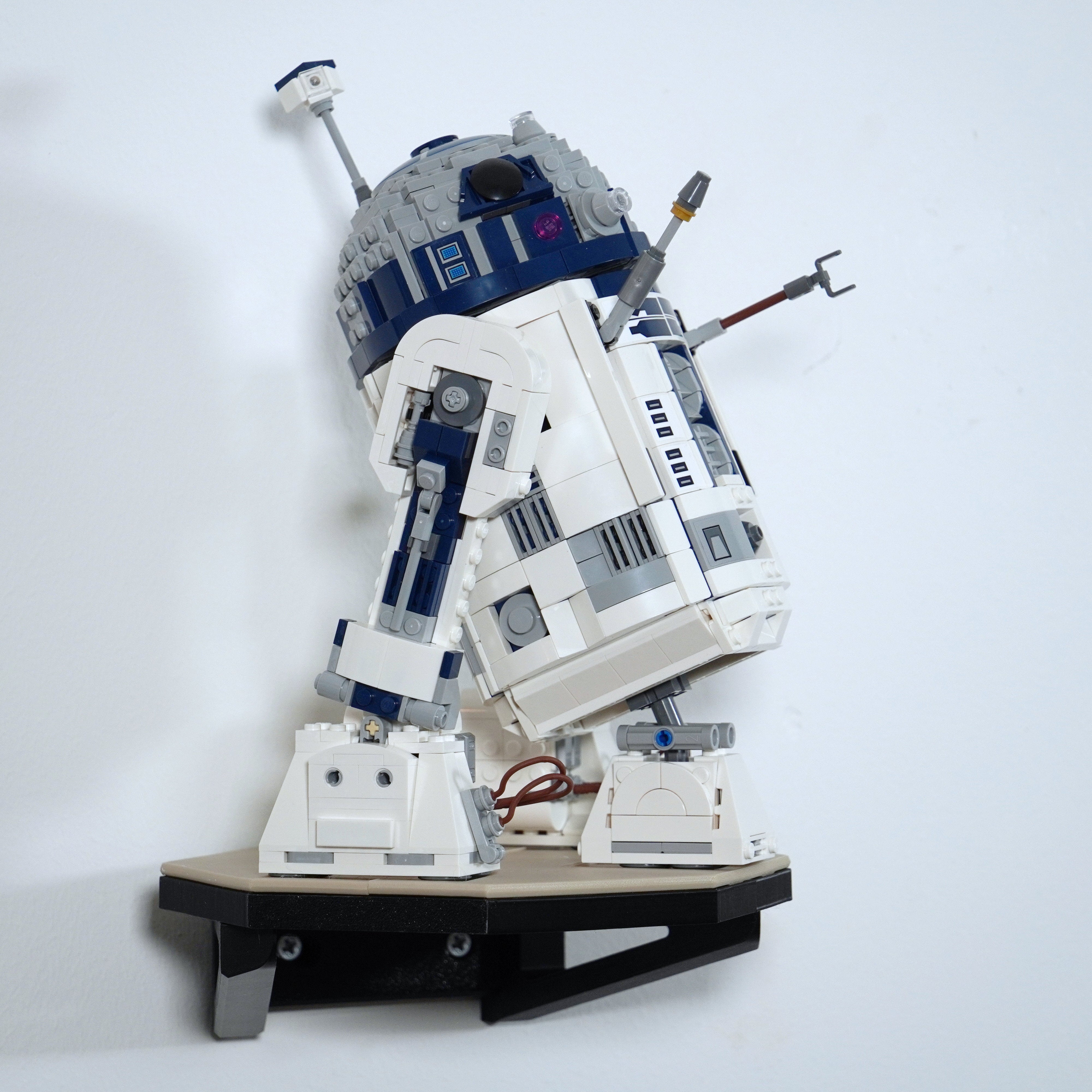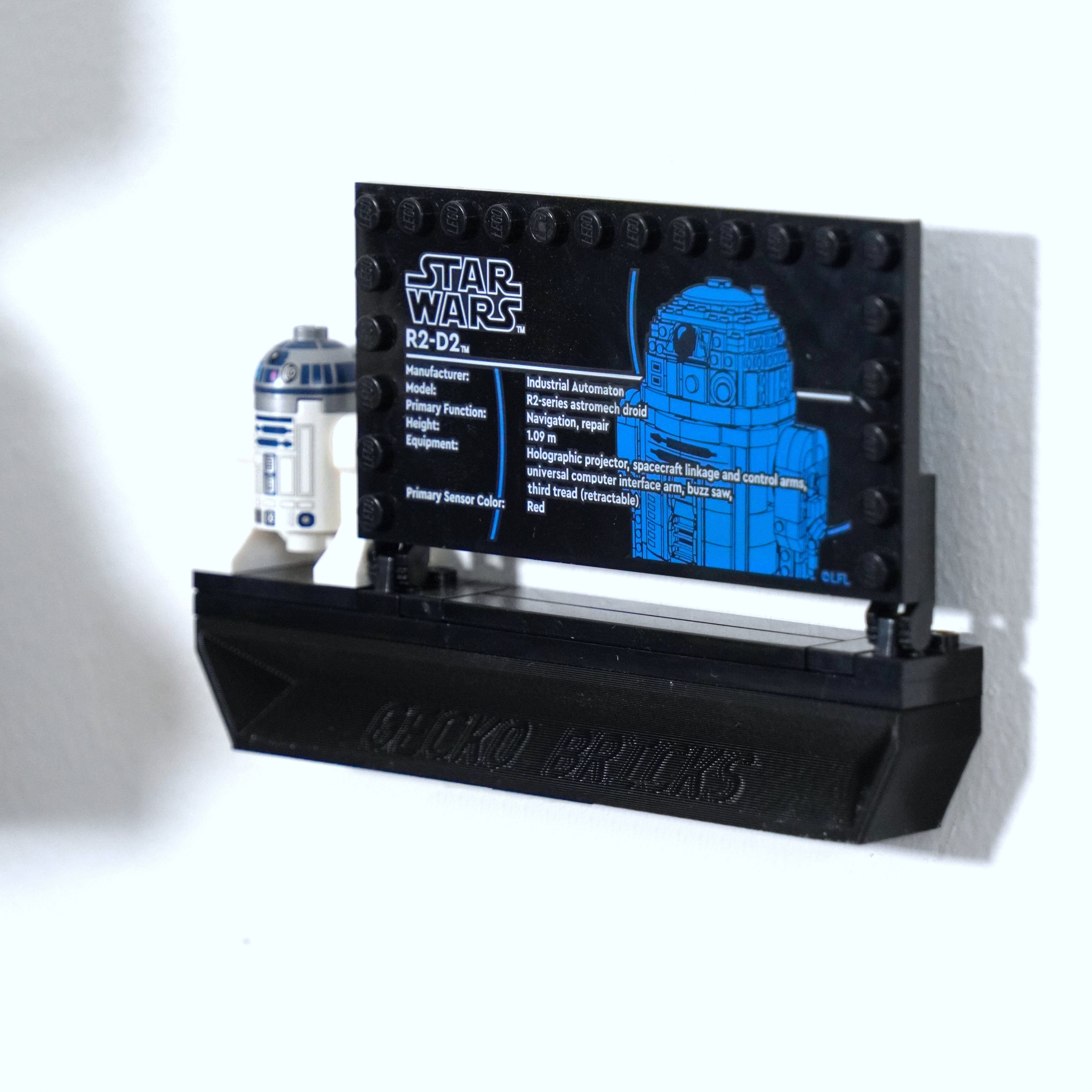 Dette justerbare vægbeslag gør det muligt at udstille dit R2-D2 sæt vendt fremad, mod venstre eller højre. Løsningen monteres sikkert med to skruer og inkluderer en holder til både informationskort og minifigur, hvilket sikrer en komplet og fleksibel præsentation på væggen.