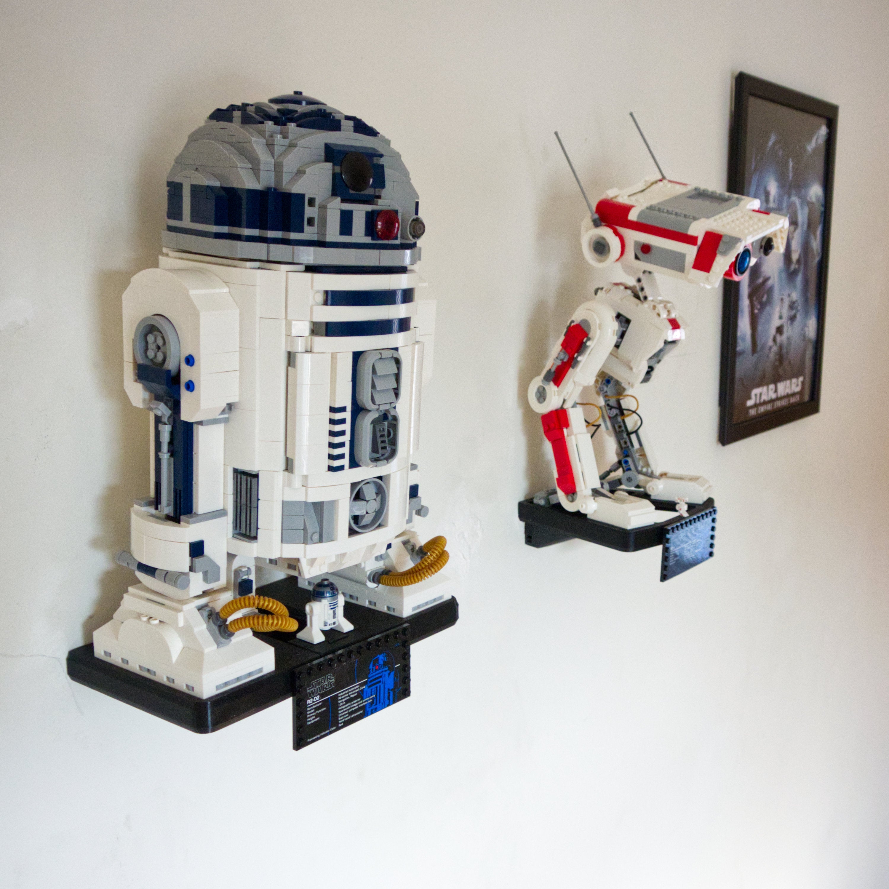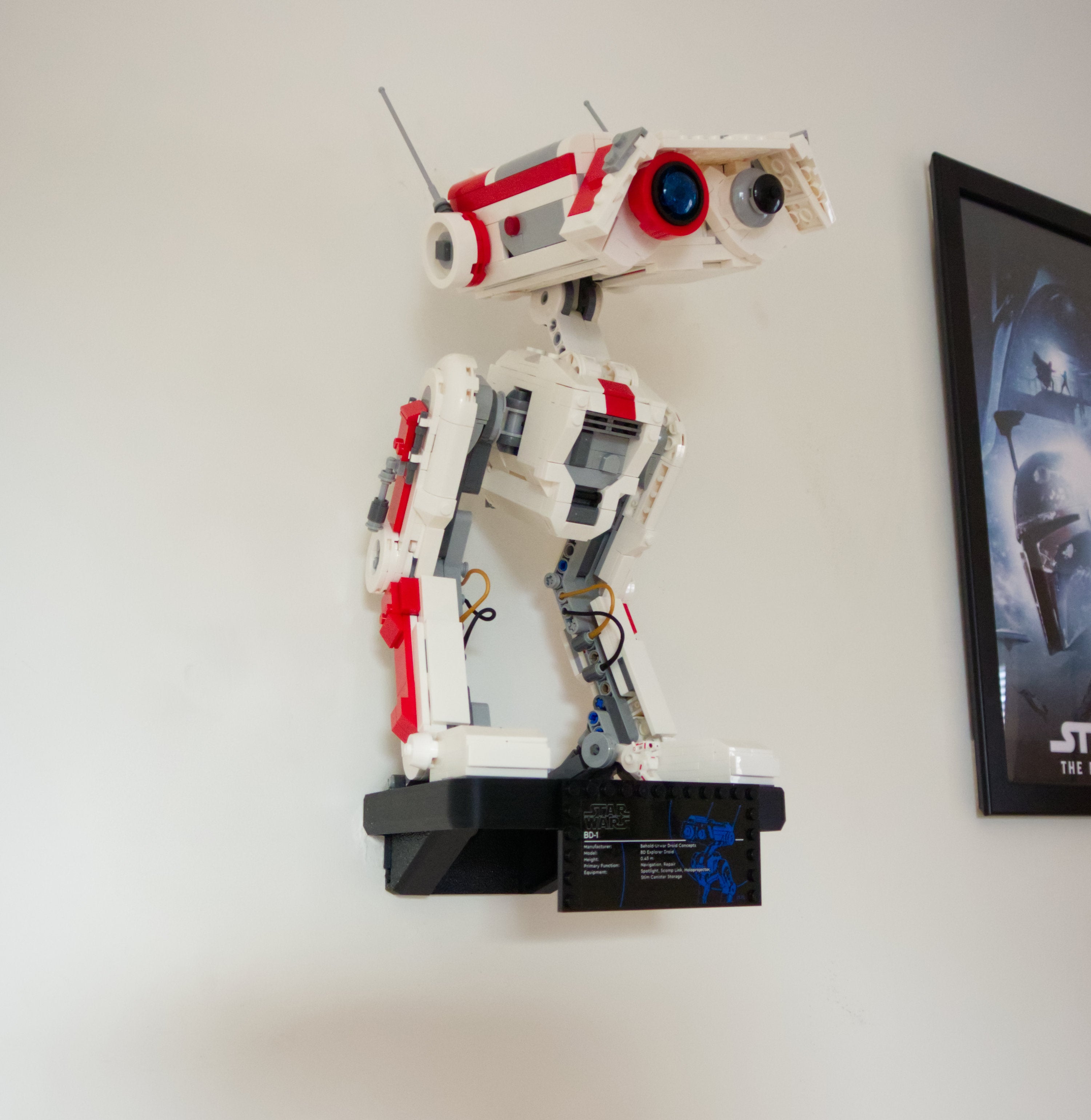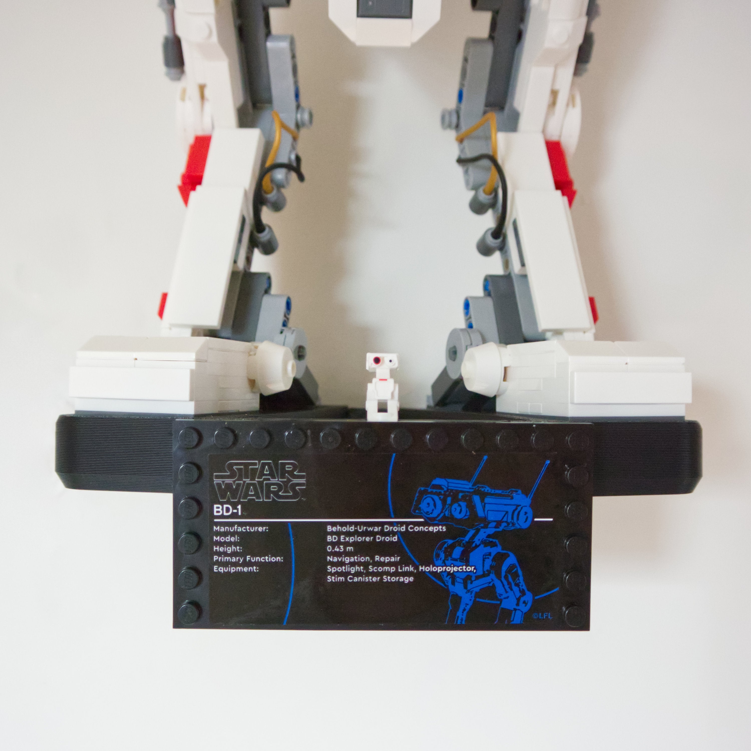 Dette vægophæng er designet til sikkert at udstille LEGO Star Wars BD-1 sættet på væggen. Holderen har integreret plads til både informationspladen og den lille droide-minifigur ved basen. Løsningen kræver minimal montering med en enkelt skrue, hvilket giver en pæn og organiseret fremvisning af modellen.