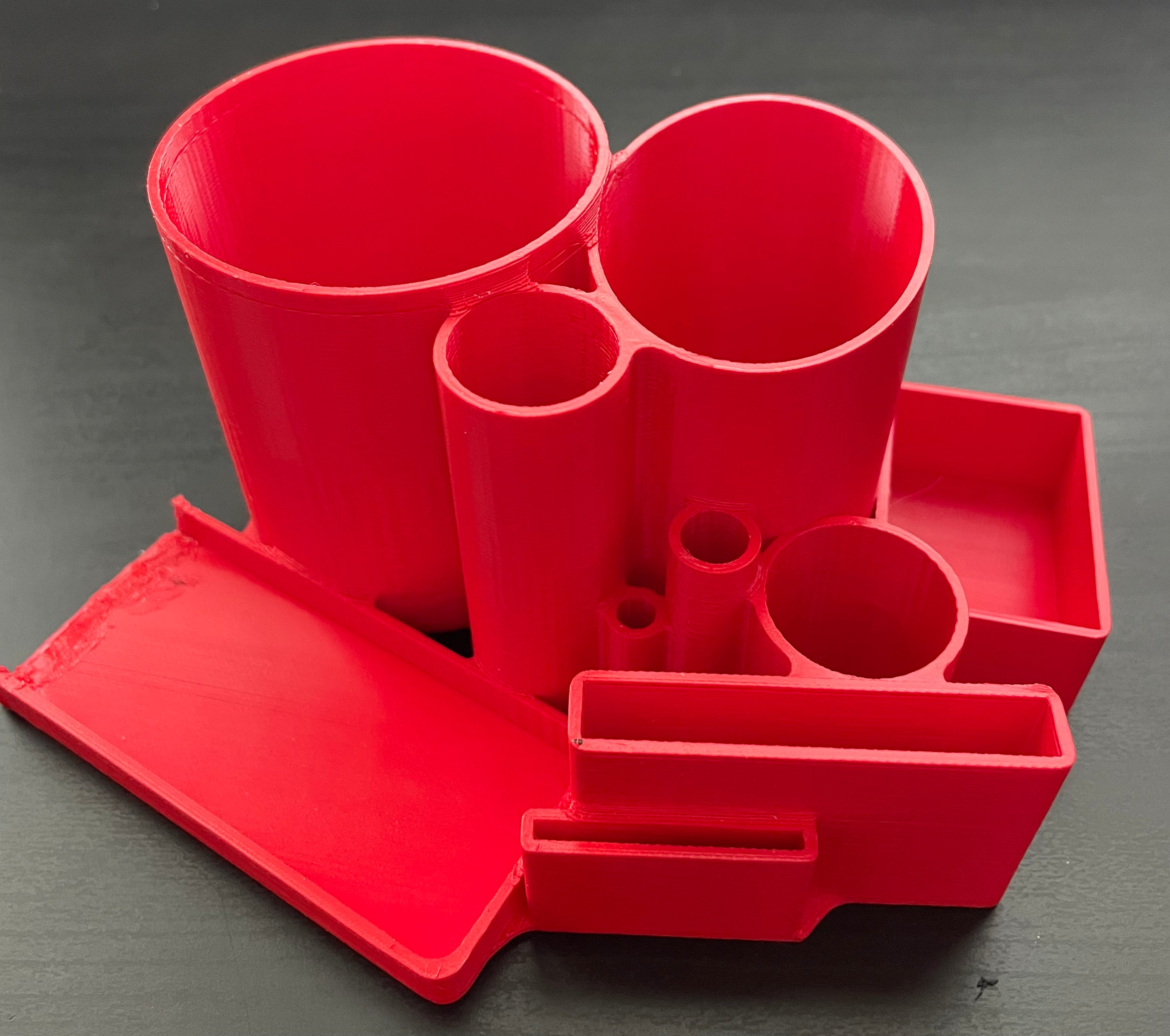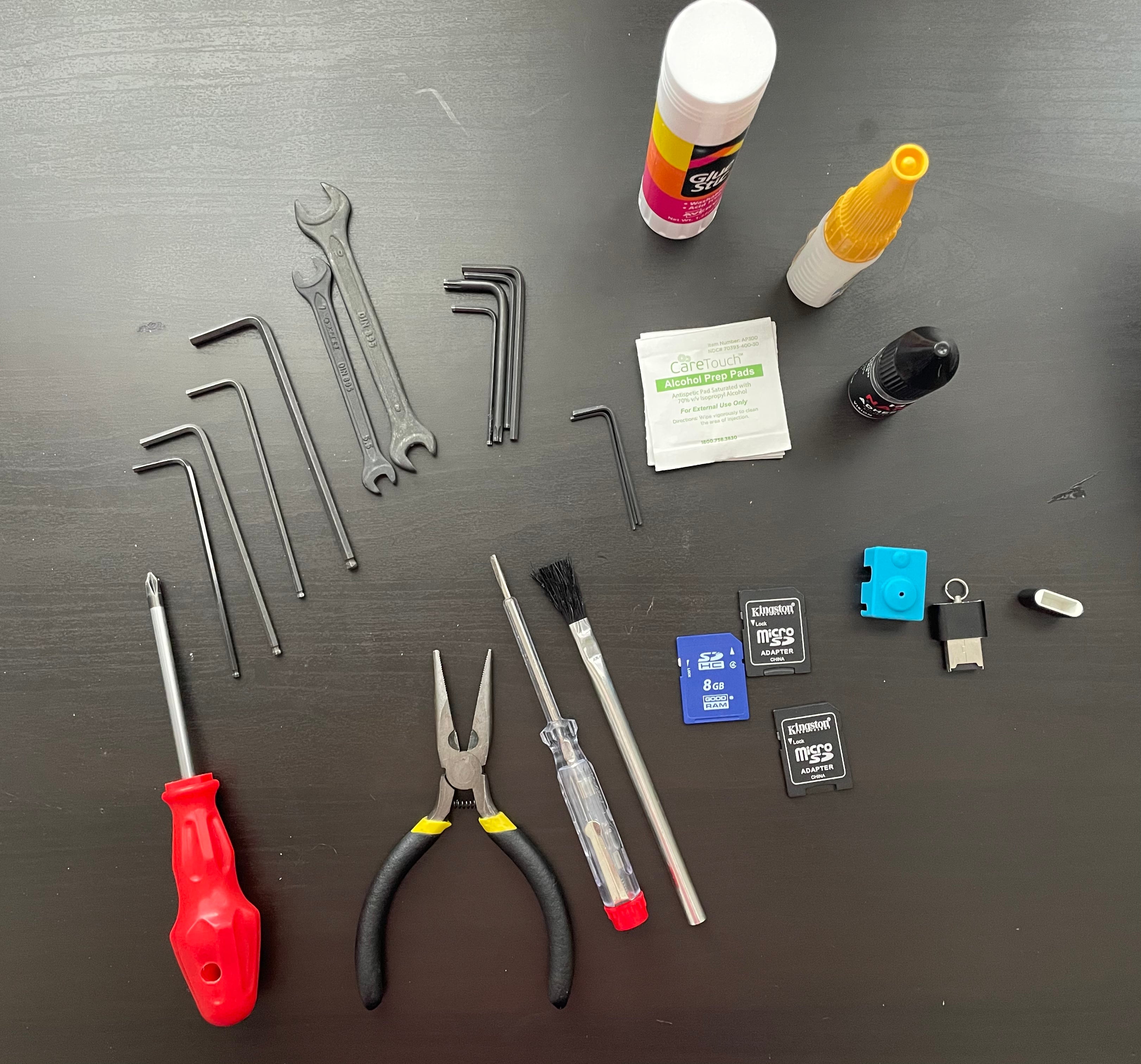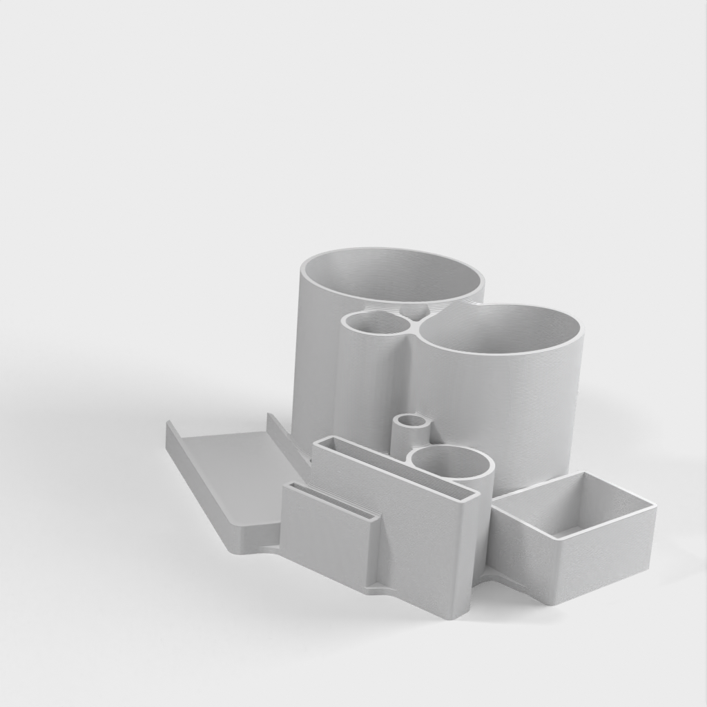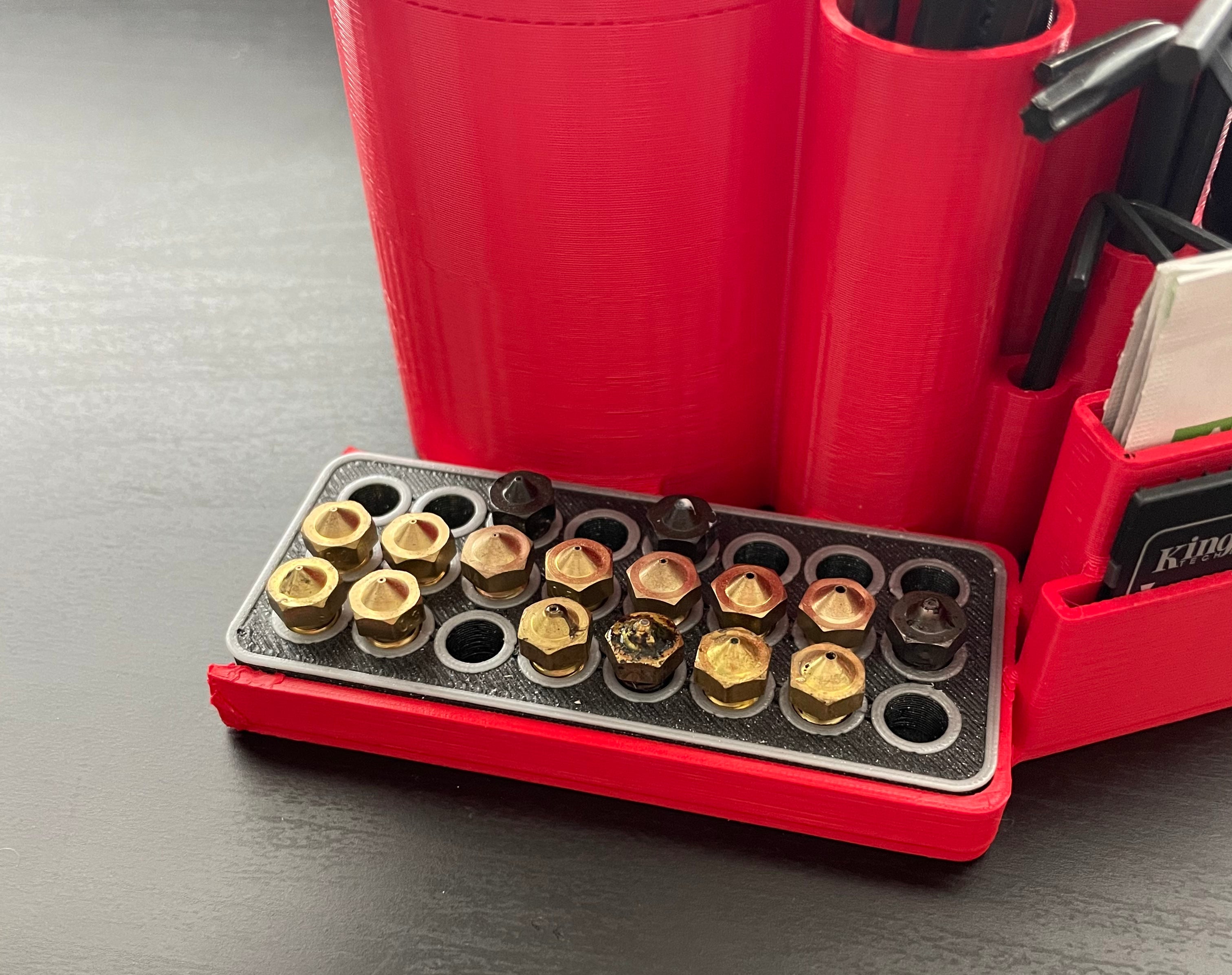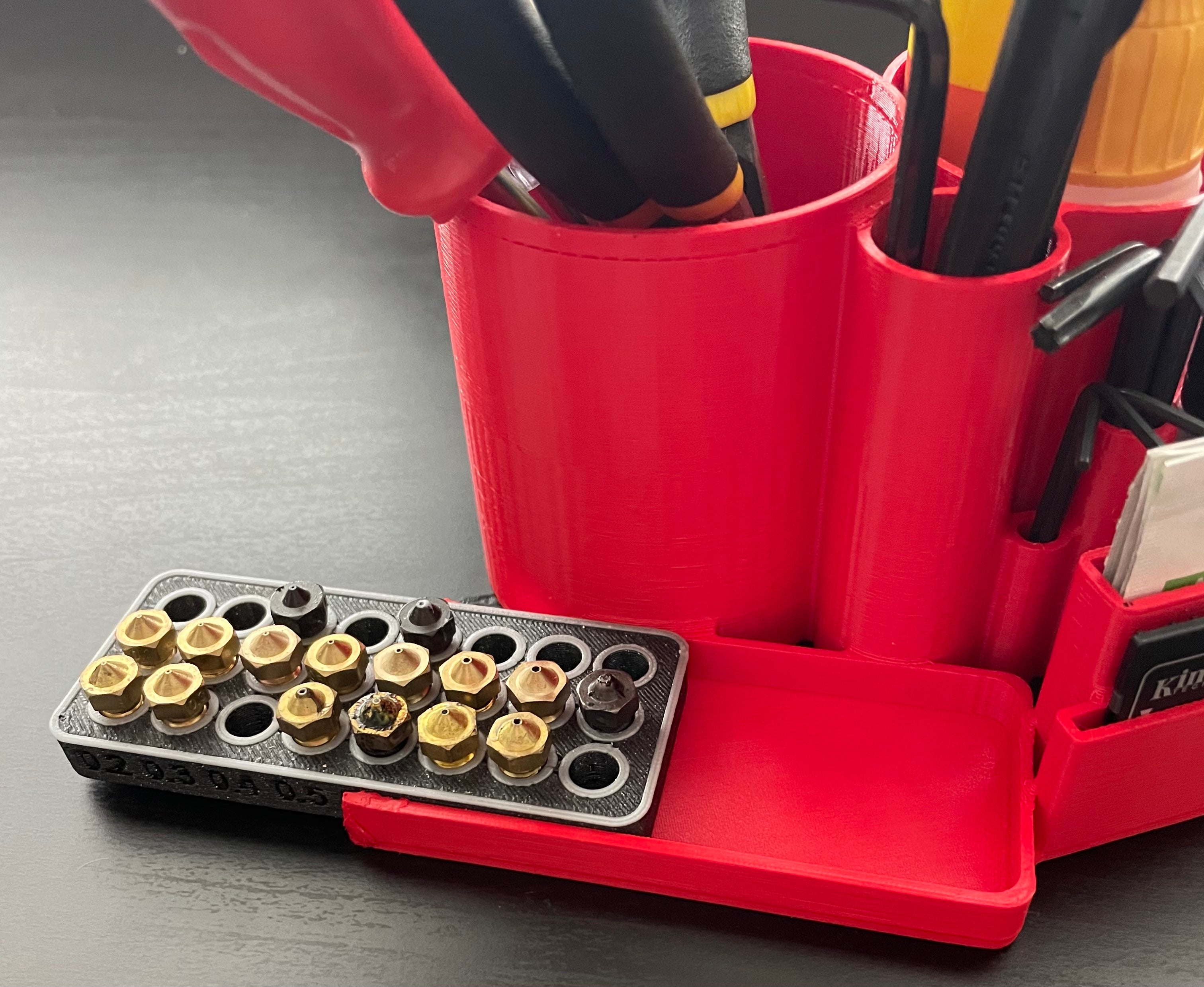 Et værktøjsholder og organizer jeg har designet til at opbevare alle mine værktøjer. Det passer komfortabelt ved siden af printeren. Den er kompatibel med denne dyseholder: https://www.prusaprinters.org/prints/57441-nozzle-organizer. Redskaber som dyser, børster, lim, tang, skruetrækkere, Allen-nøgler, microSD-kort, SD-kort og klude kan alle opbevares i denne holder. Det giver en nem og ryddelig opbevaring og adgang til dine nødvendige værktøjer.